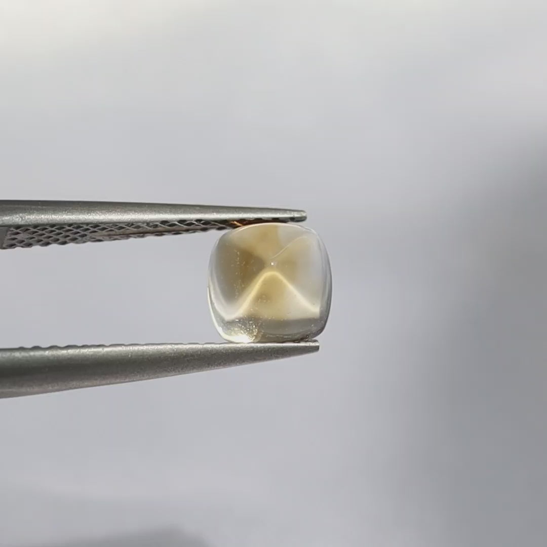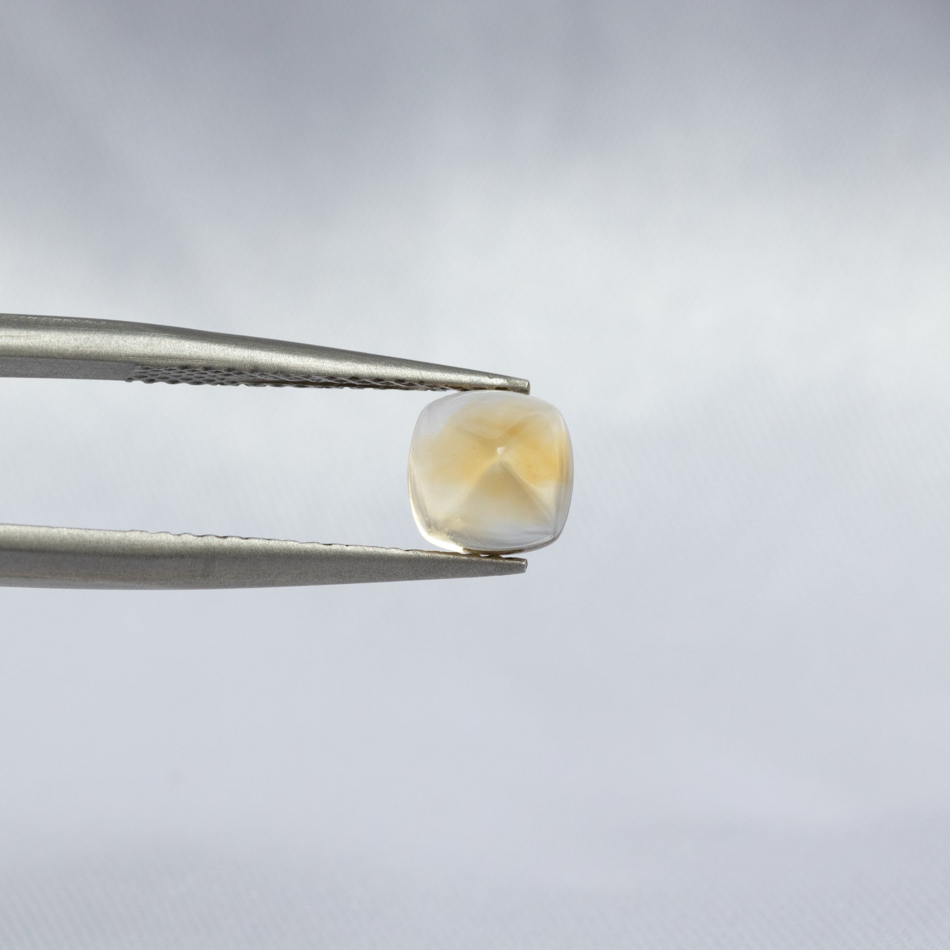 “シュガーローフ”と呼ばれる、滑らかな四角錐(ピラミッド)カットが、光を柔らかく取り込み、角度によって繊細な輝きを放ちます。