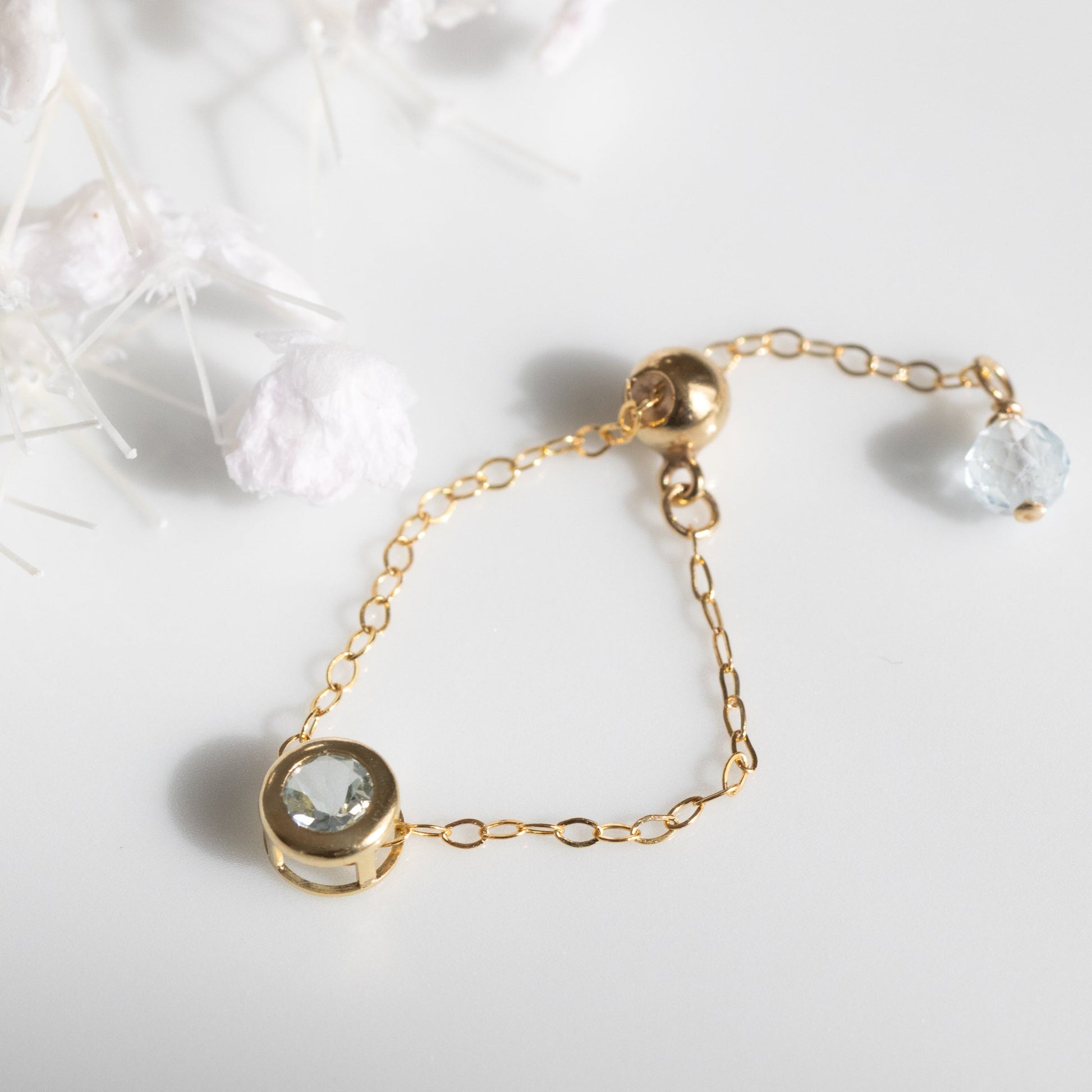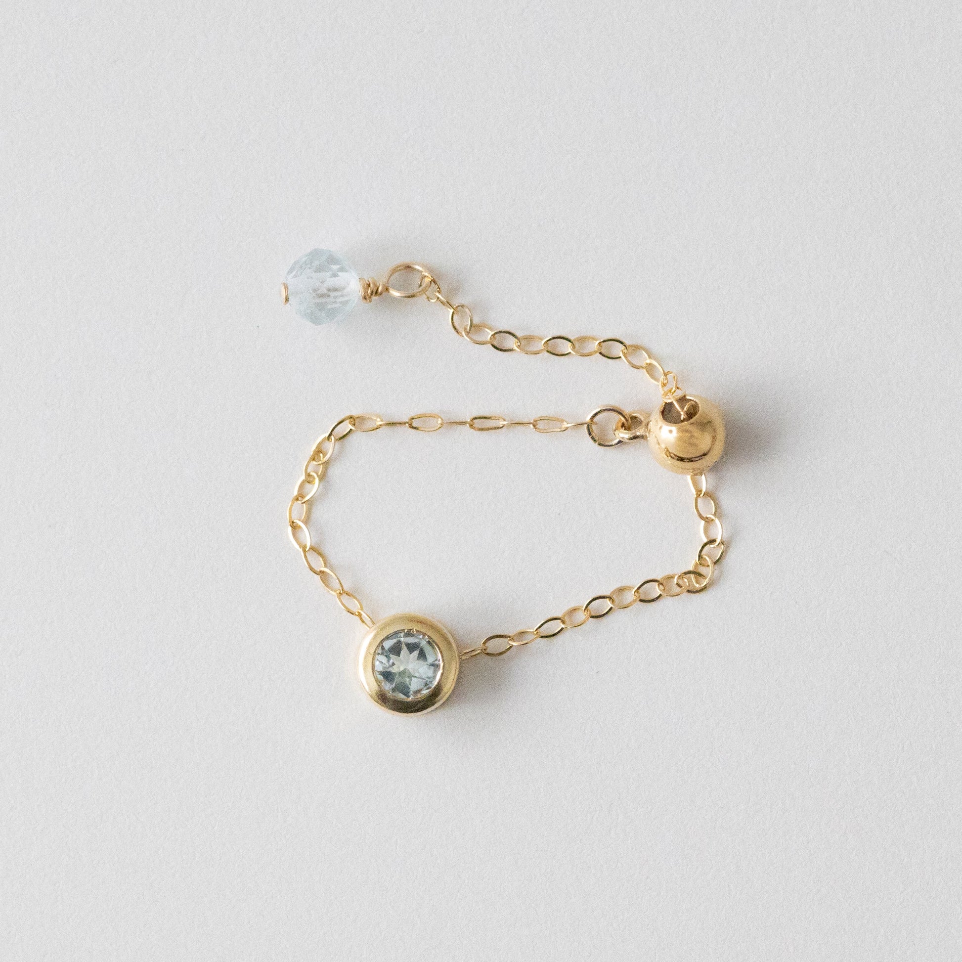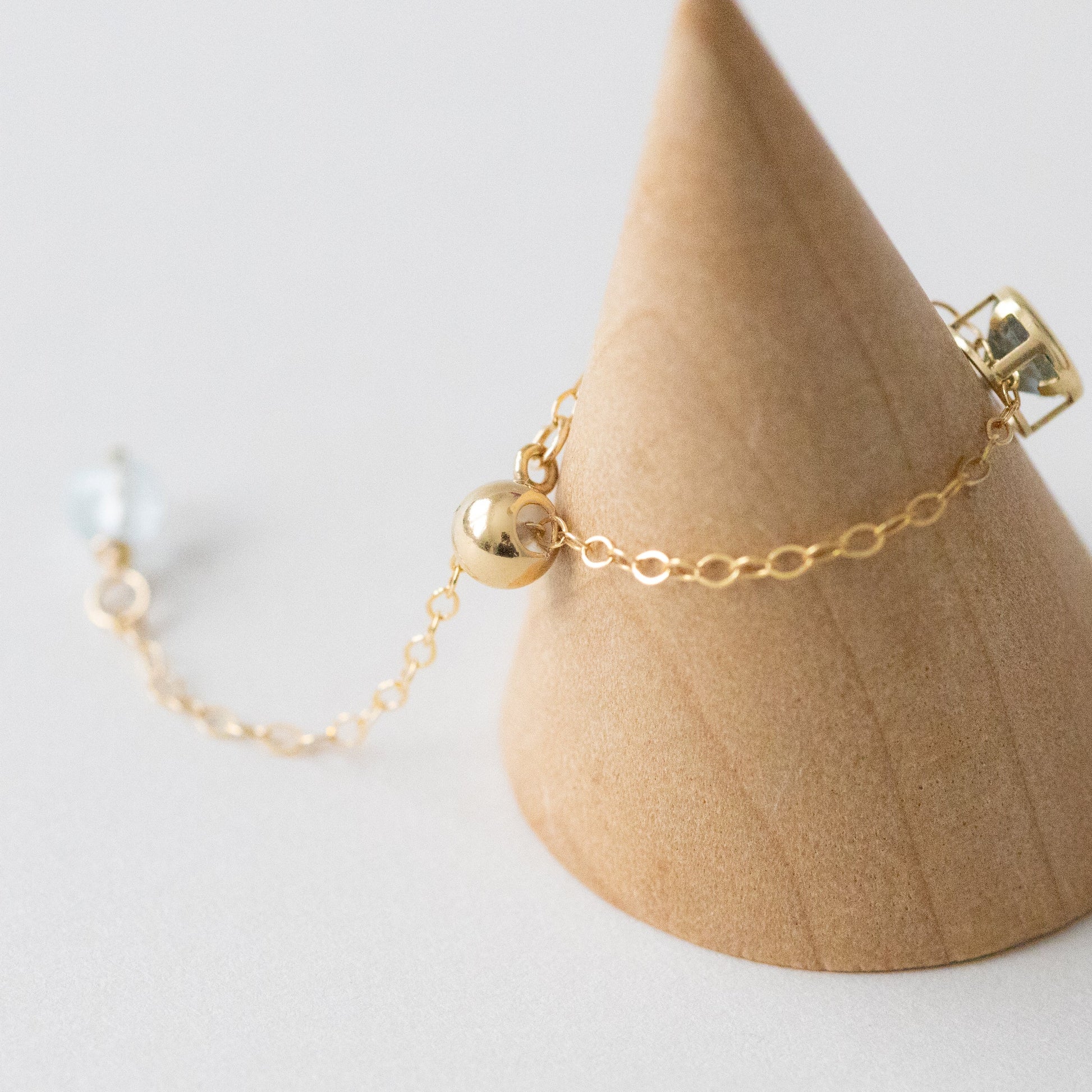 淡いブルーとゴールドの組み合わせが、上品で繊細な印象のチェーンリングです。