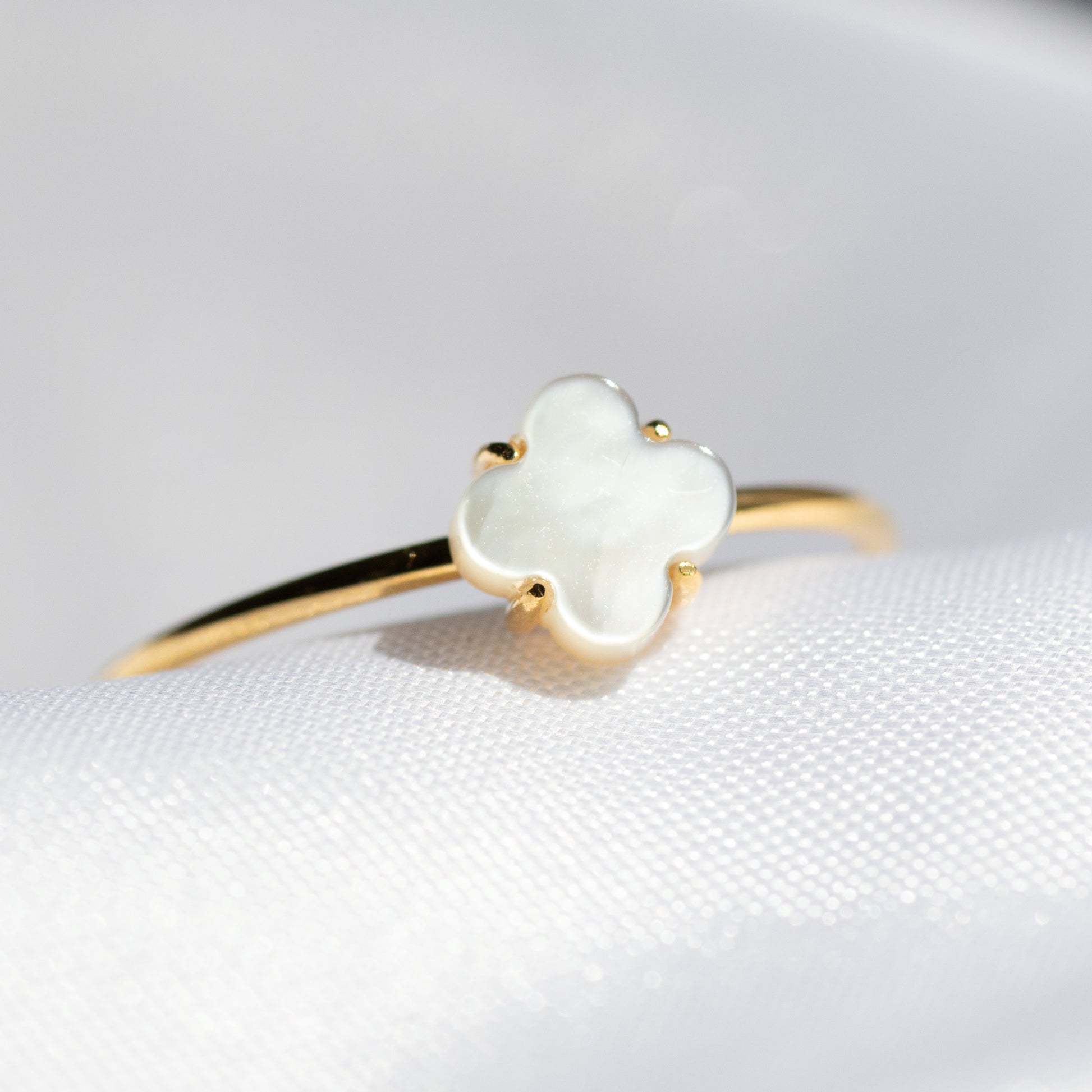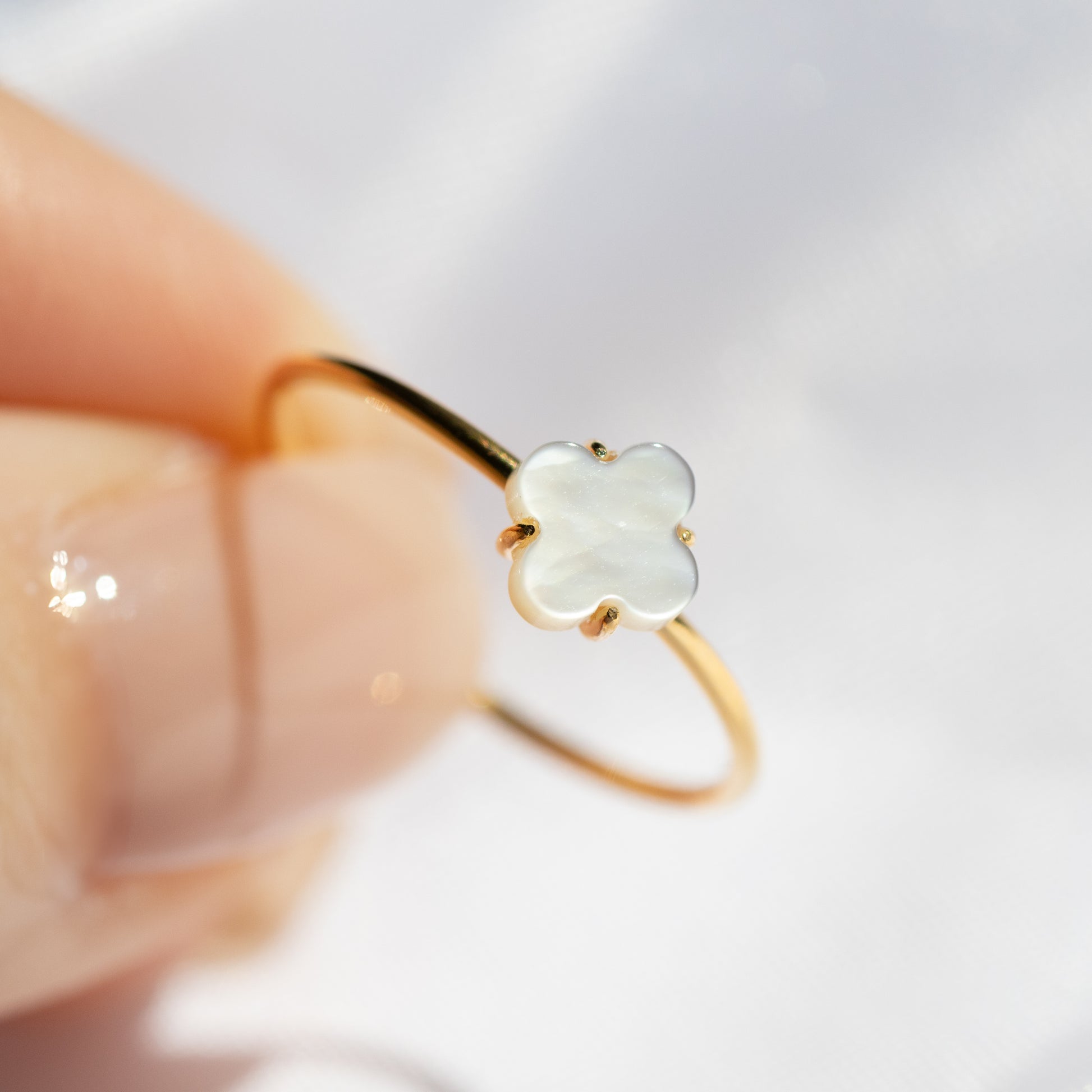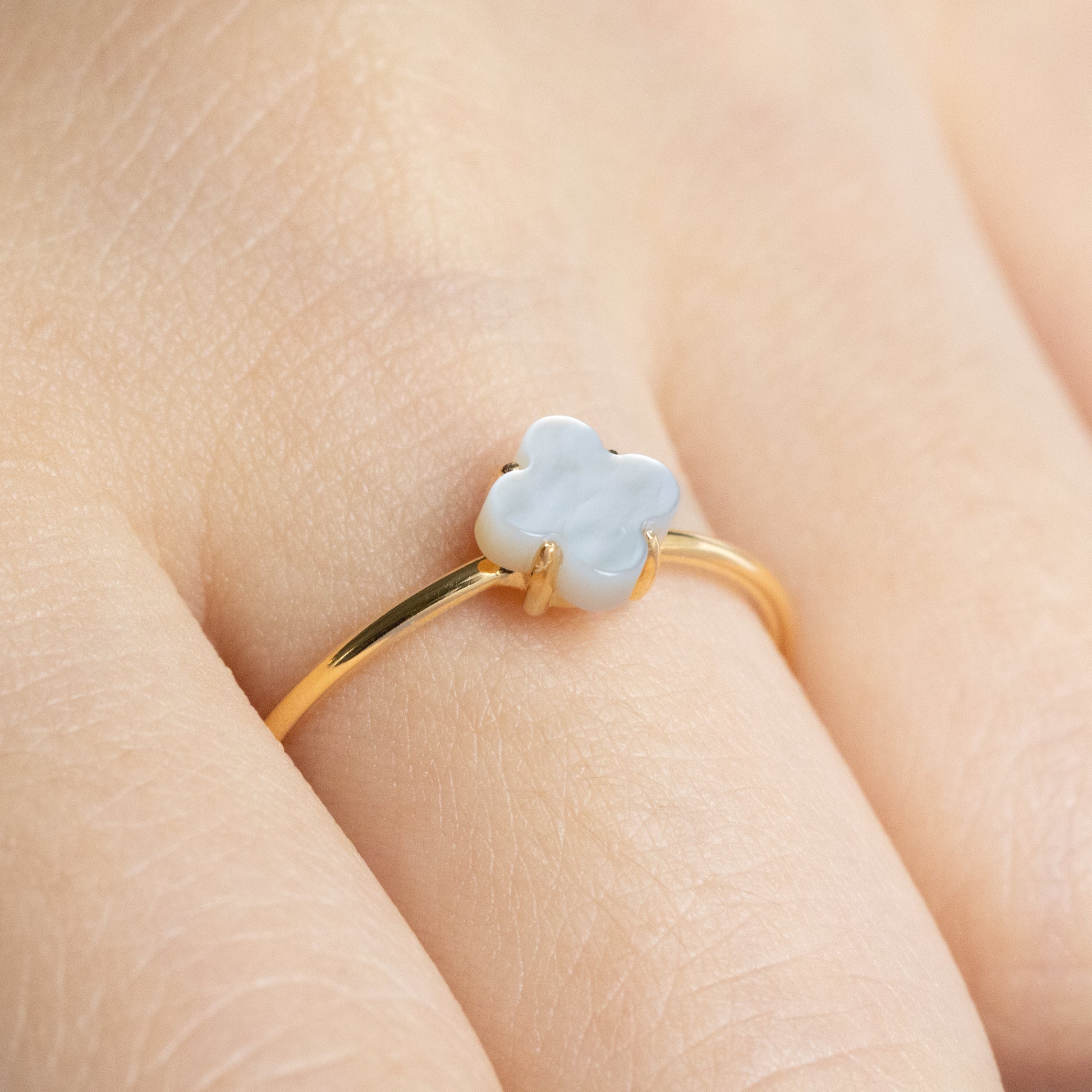 やさしく艶めくホワイトシェルを、お花の形に仕立てたフラワーリング。