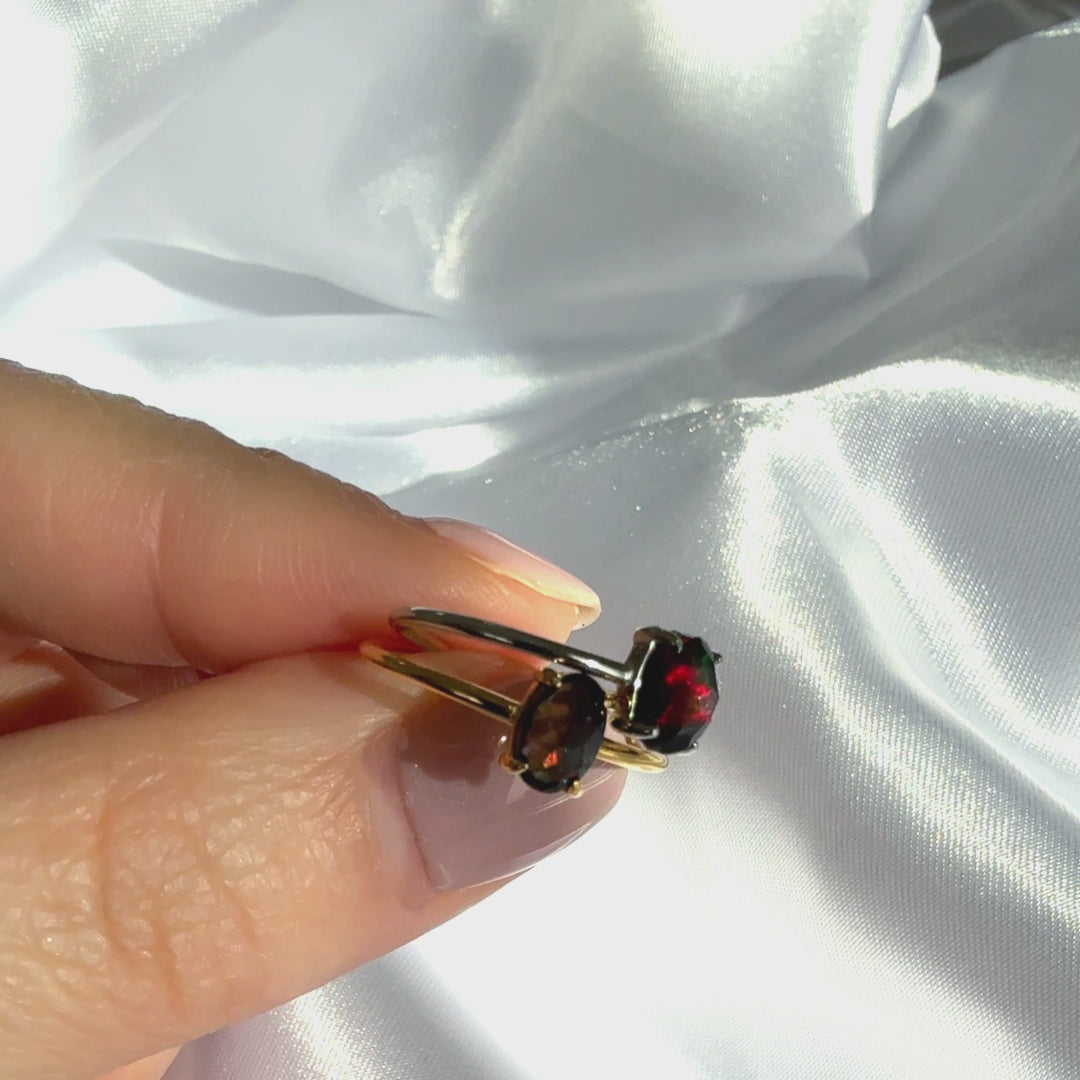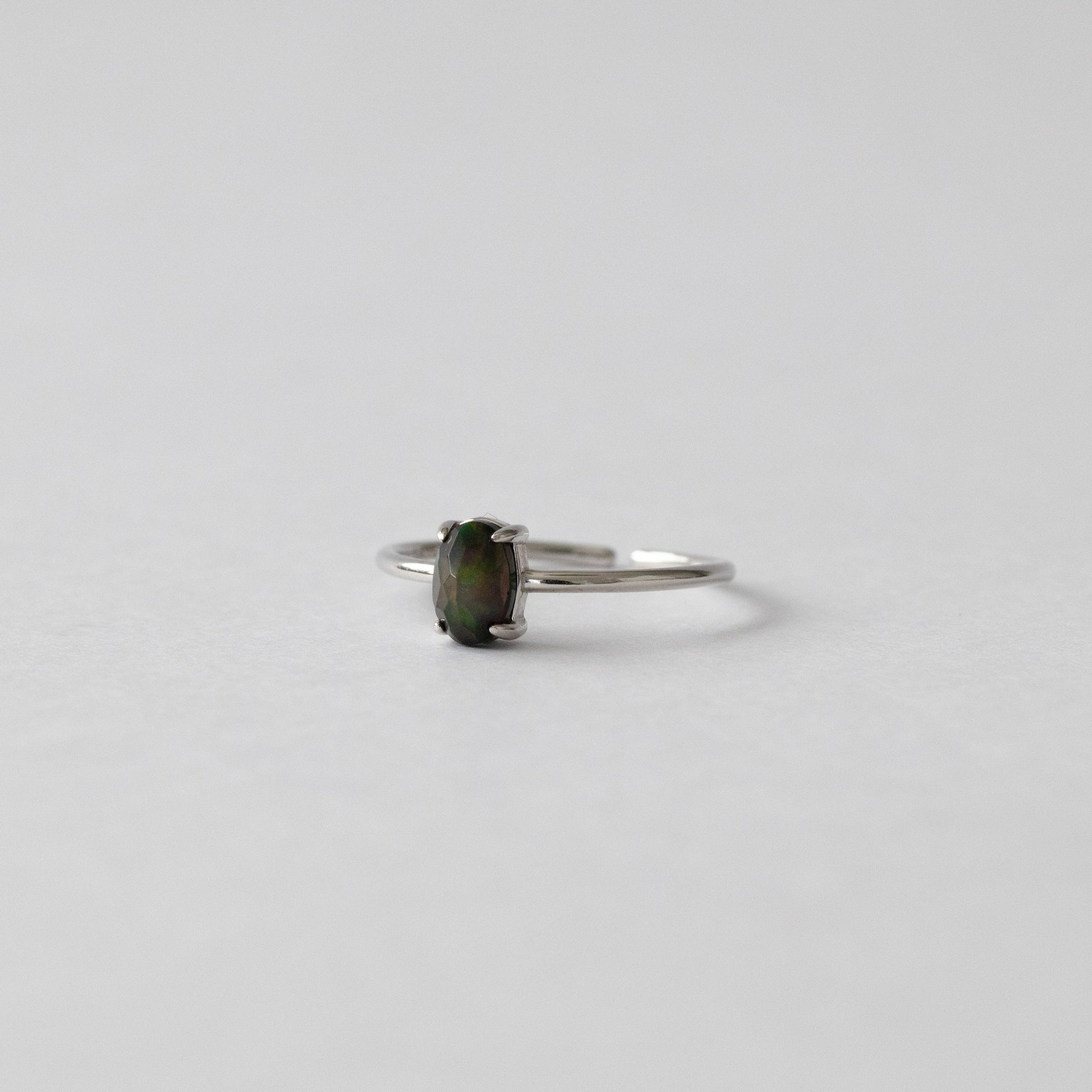 ブラックのベースに、ブルー・グリーン・レッドなど鮮やかな遊色効果がみられる魅惑的なリング。