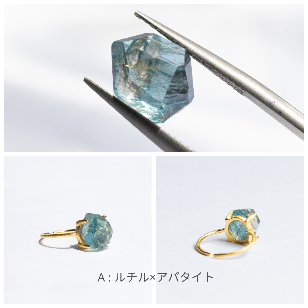 透明感のあるベースに、金色のルチルとアパタイトの鮮やかな青が交じり合う、印象的なタブレットルース。