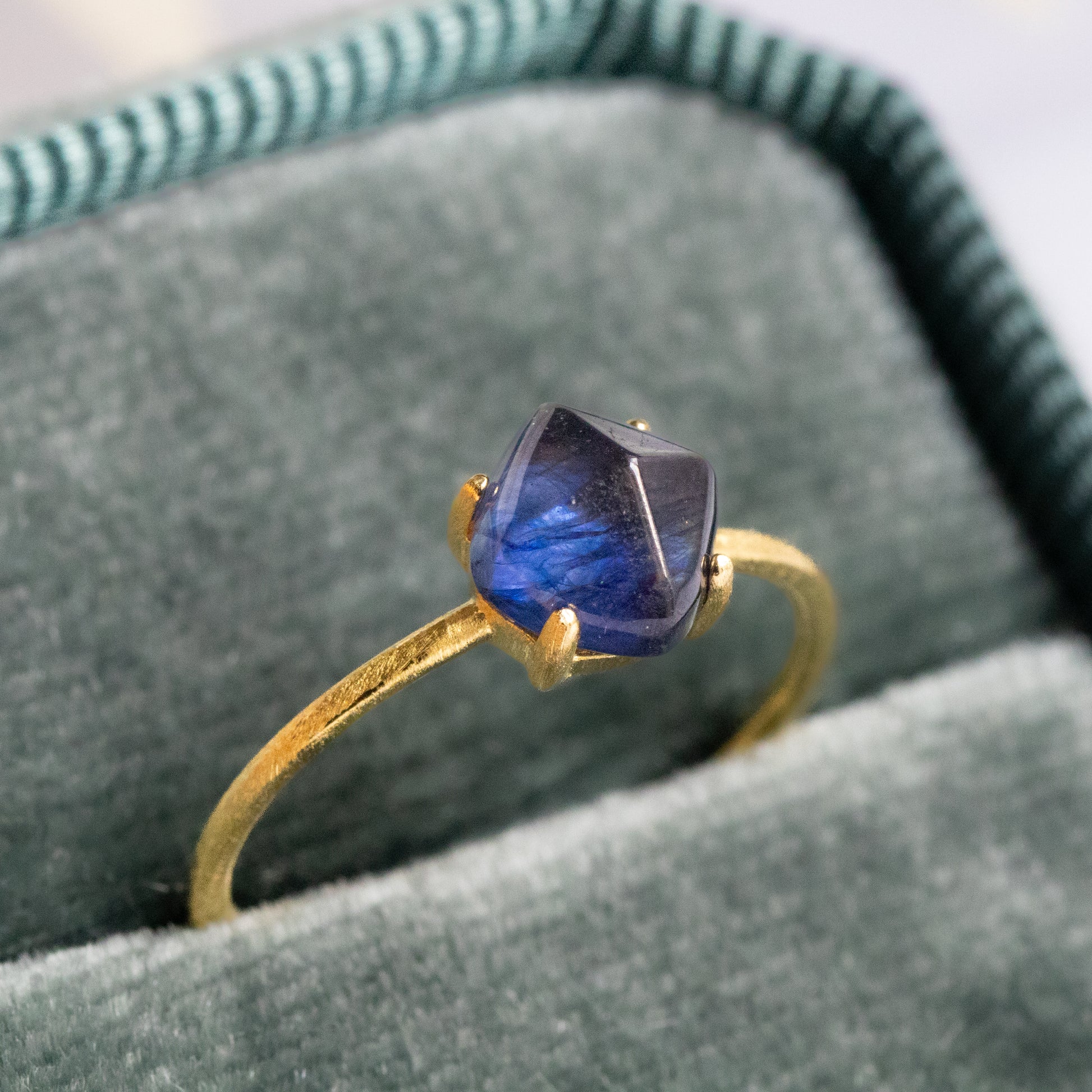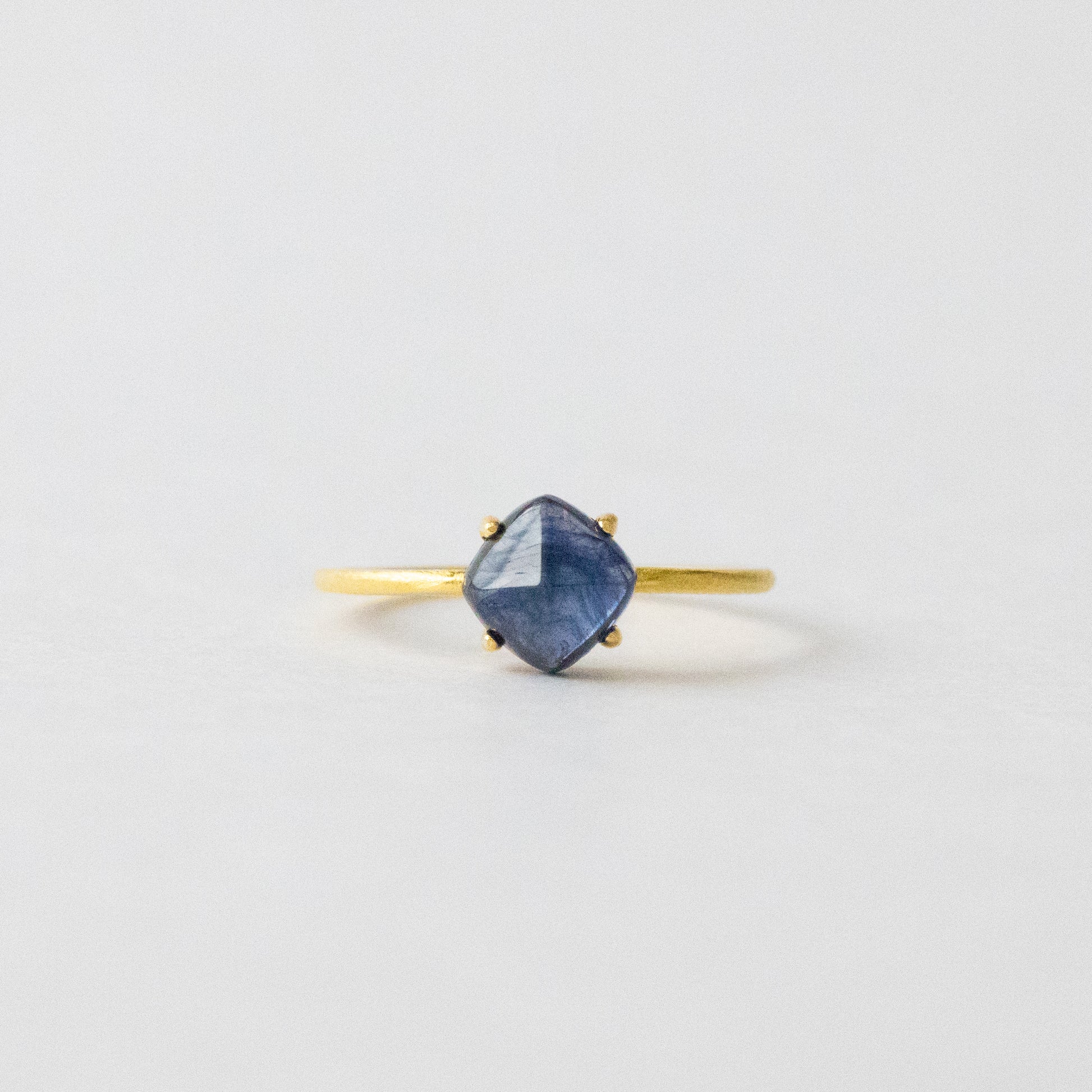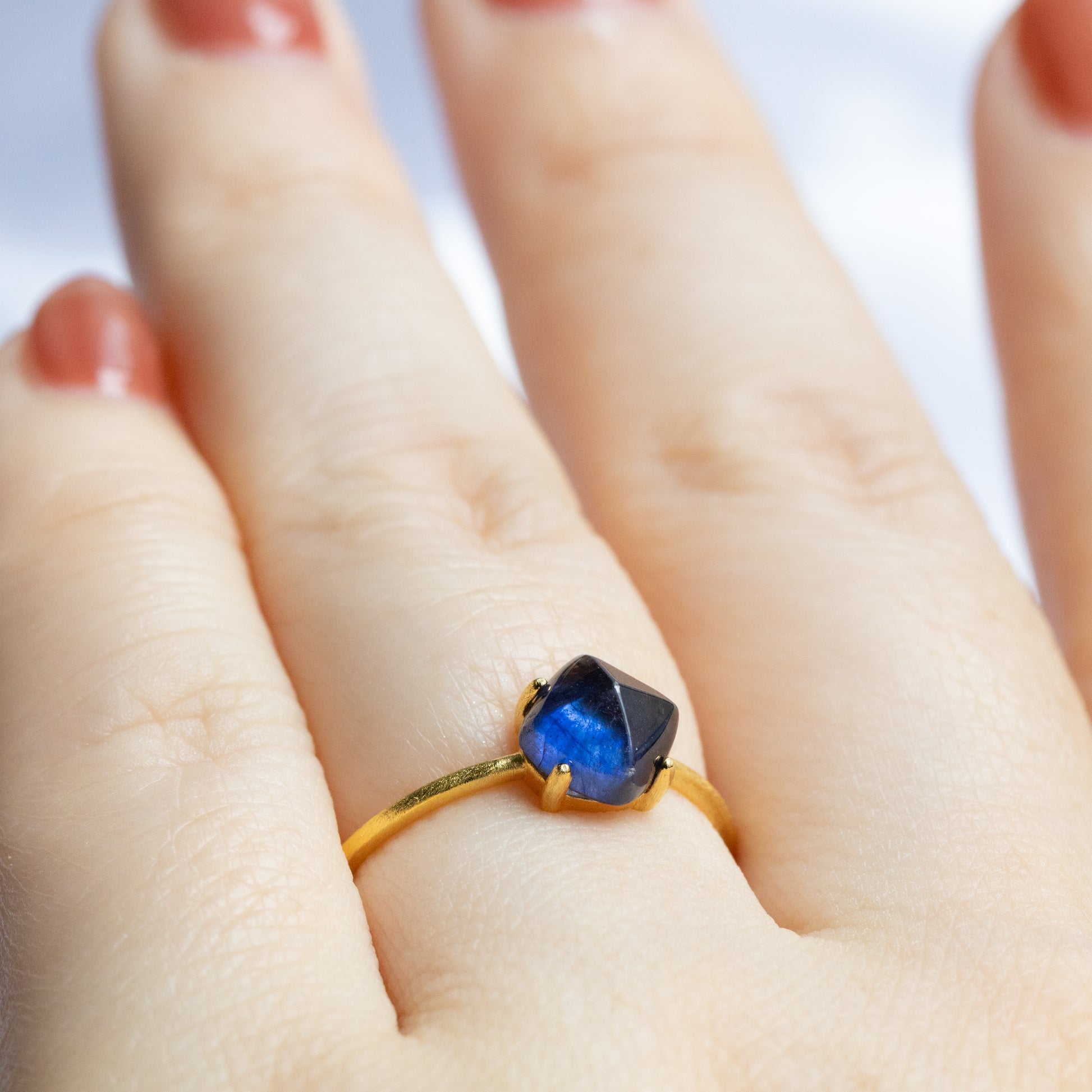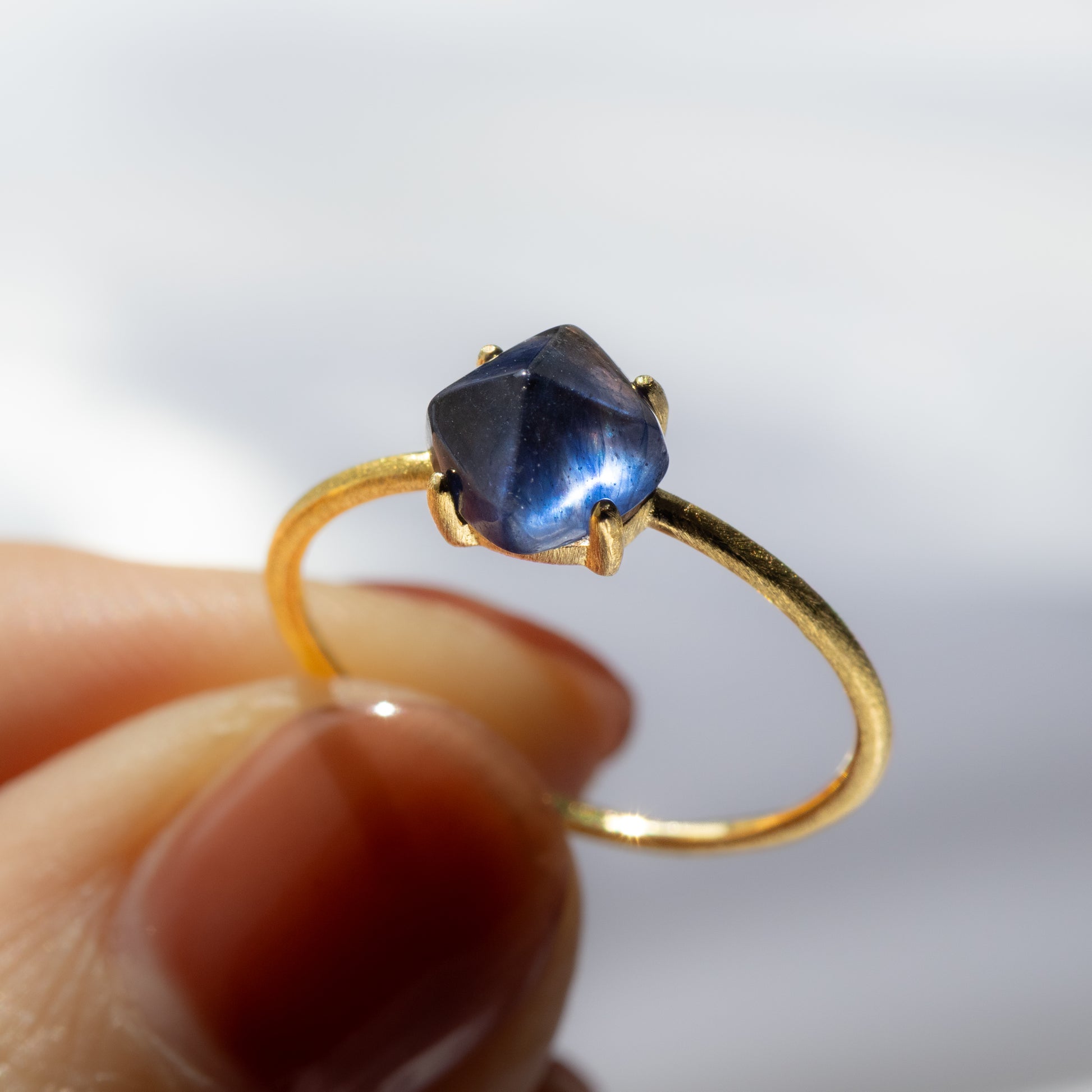 光を取り込むたびに奥行きのあるブルーがほのかに揺らめき、指先に静かな存在感を添えてくれます。
