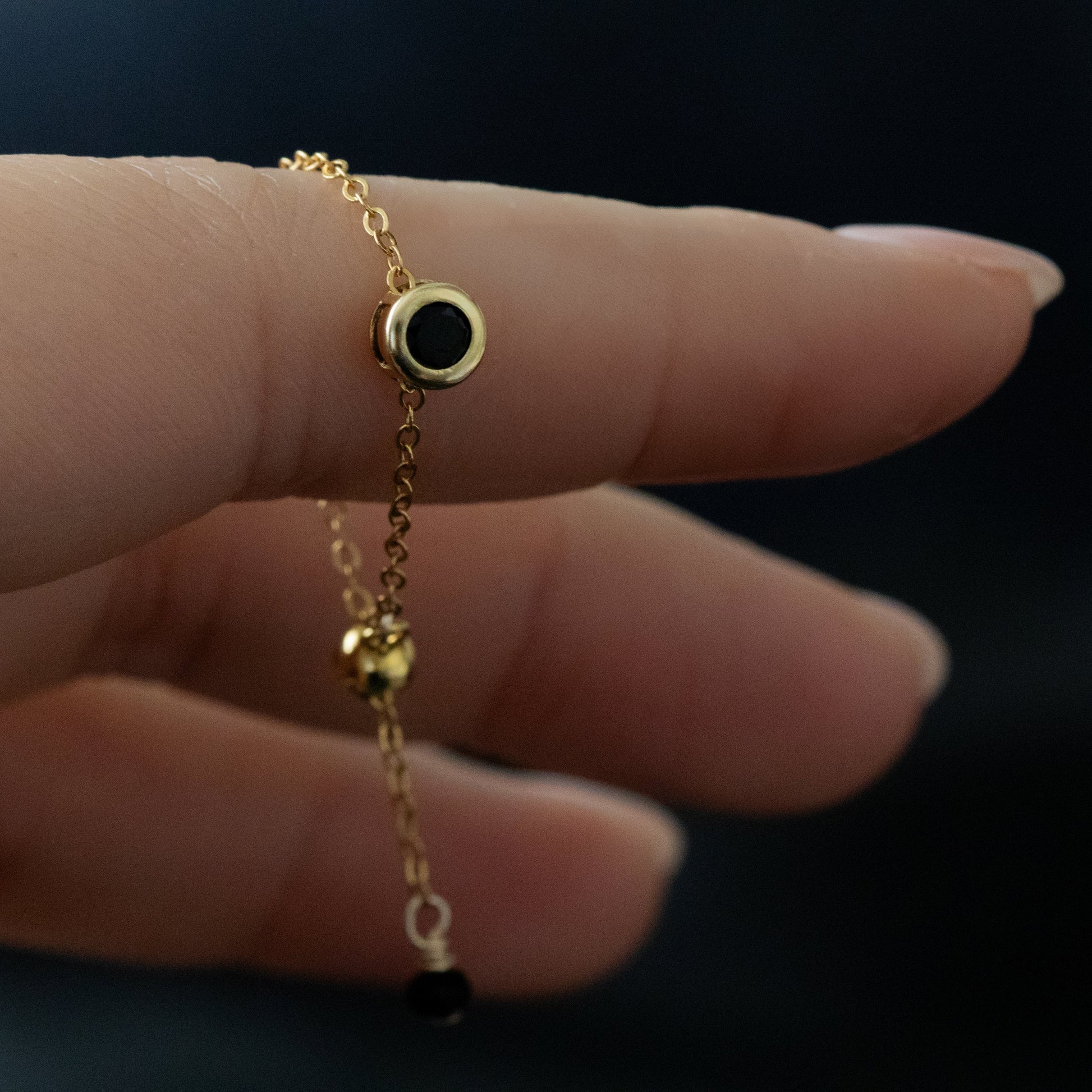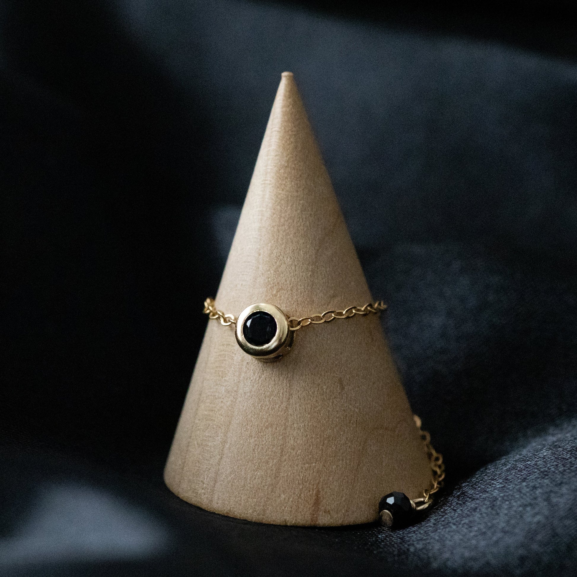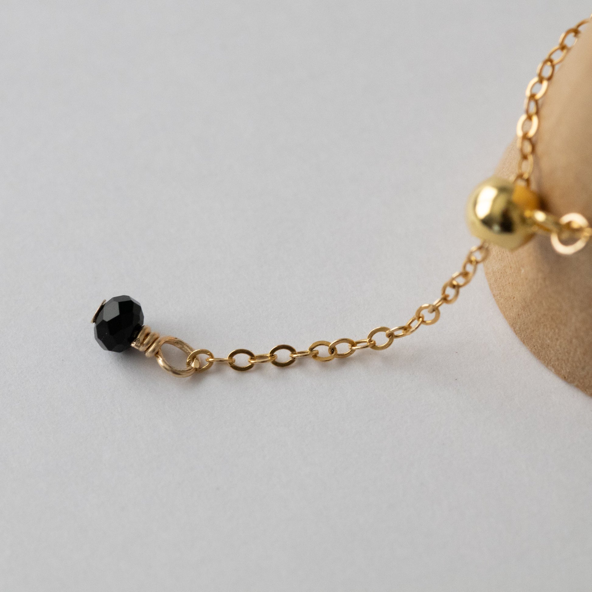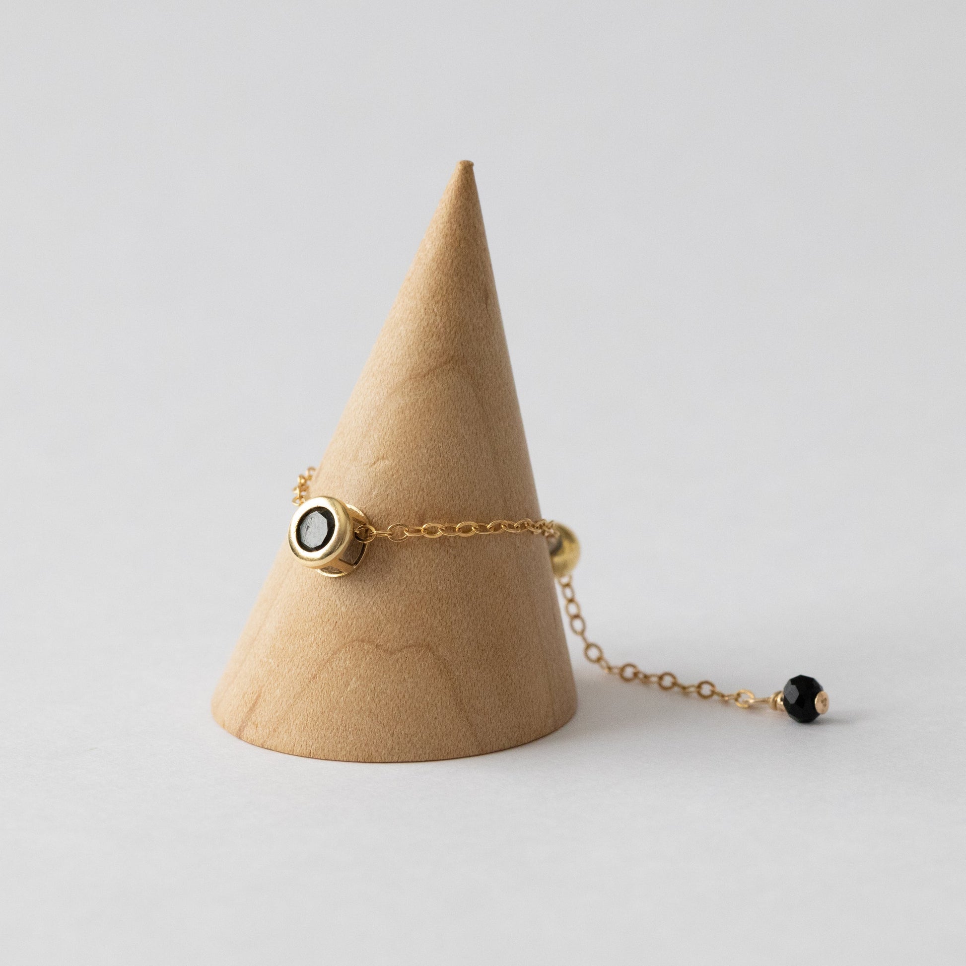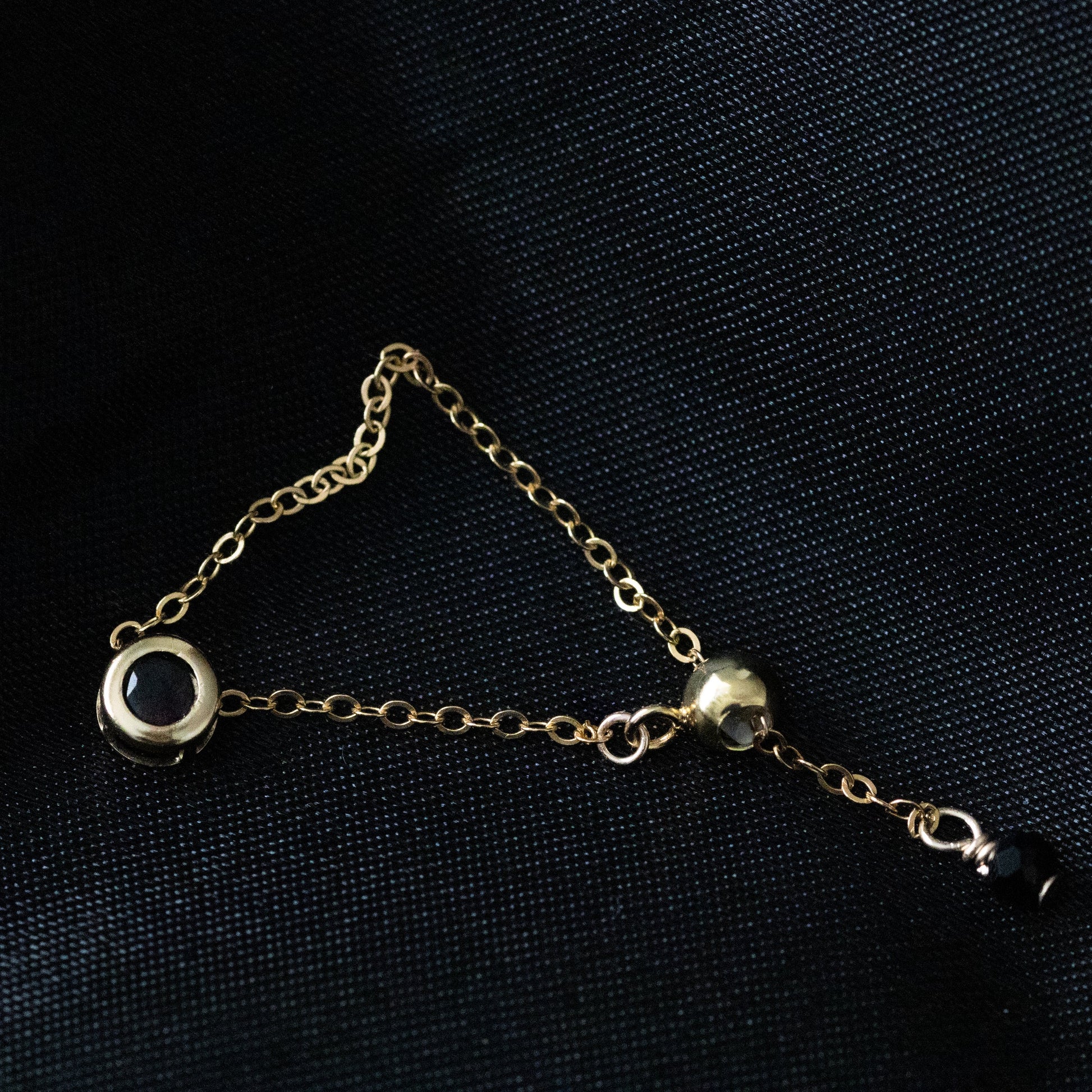 ベゼルセッティングに加え、チェーンの先端にもボタンカットのブラックスピネルを使用。