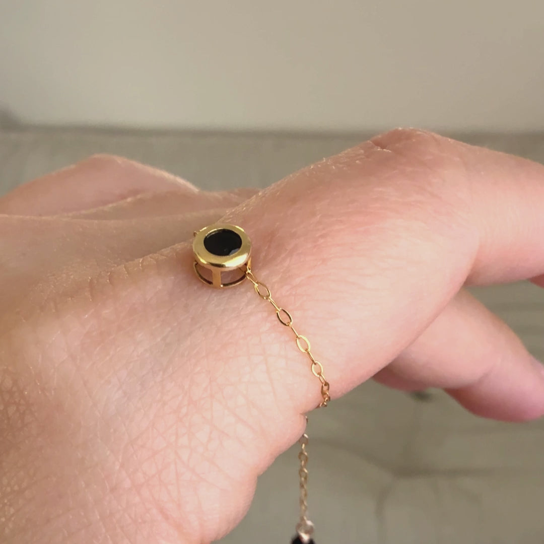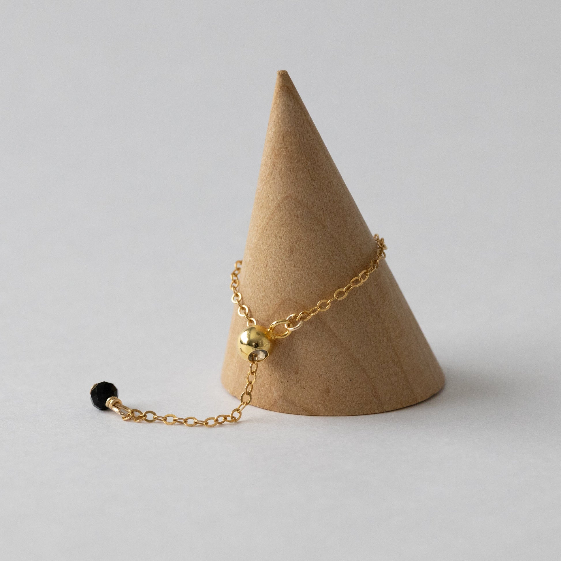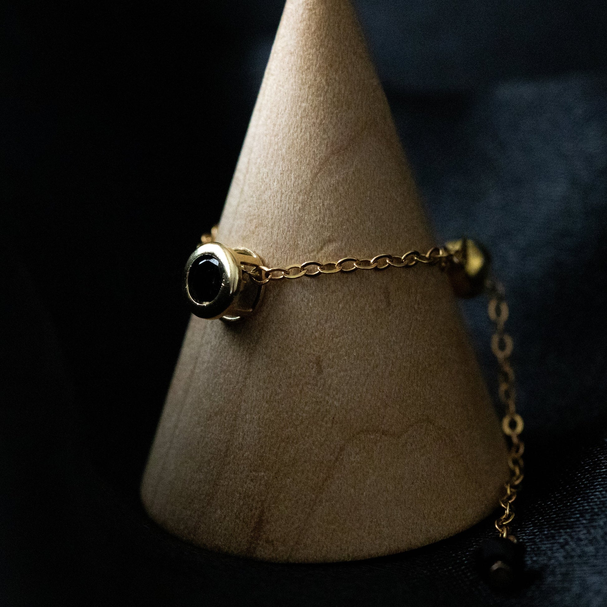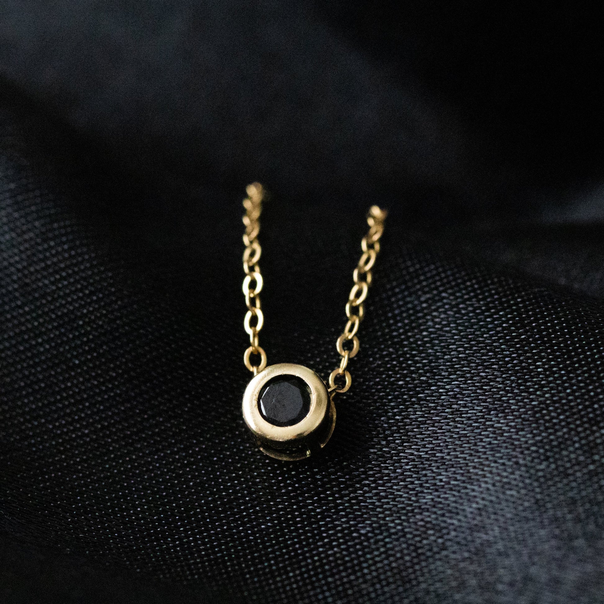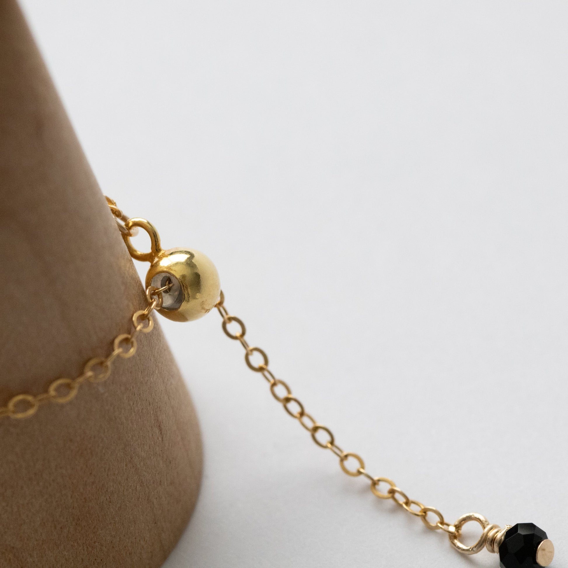 ベゼルセッティングに加え、チェーンの先端にもボタンカットのブラックスピネルを使用。