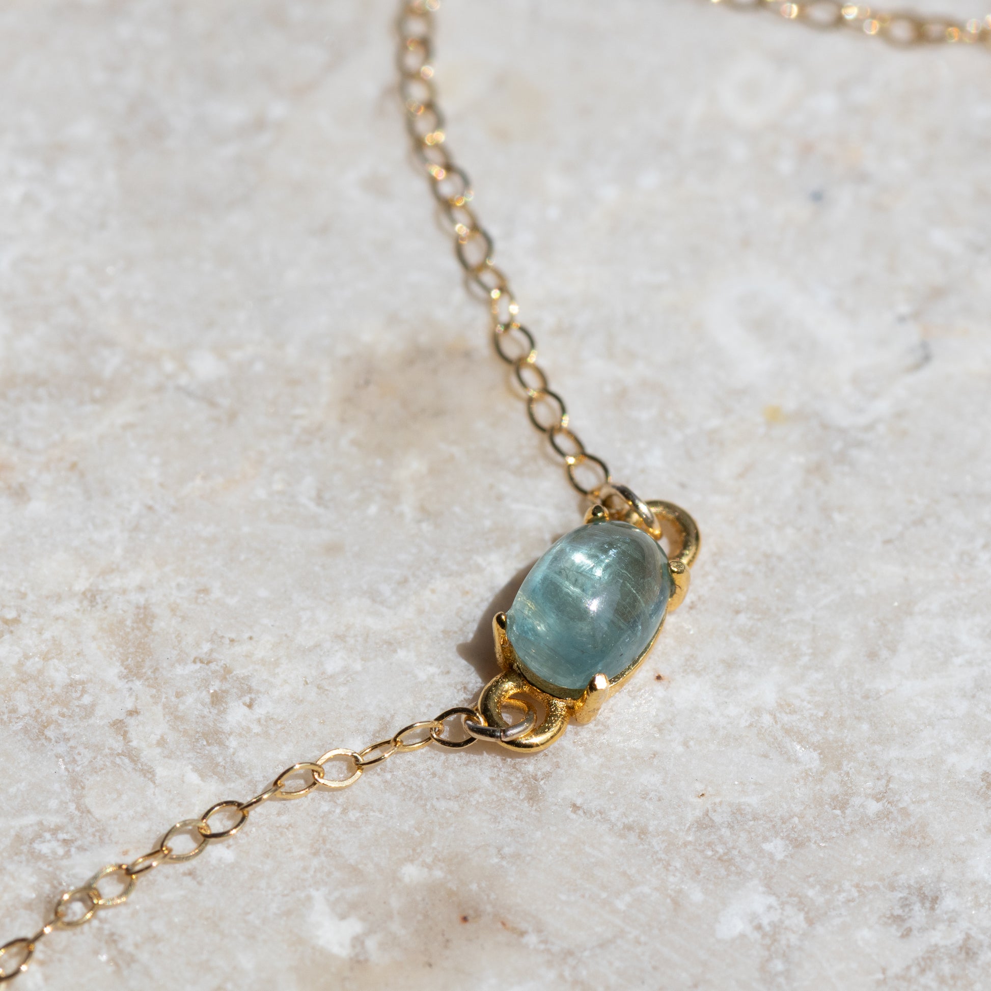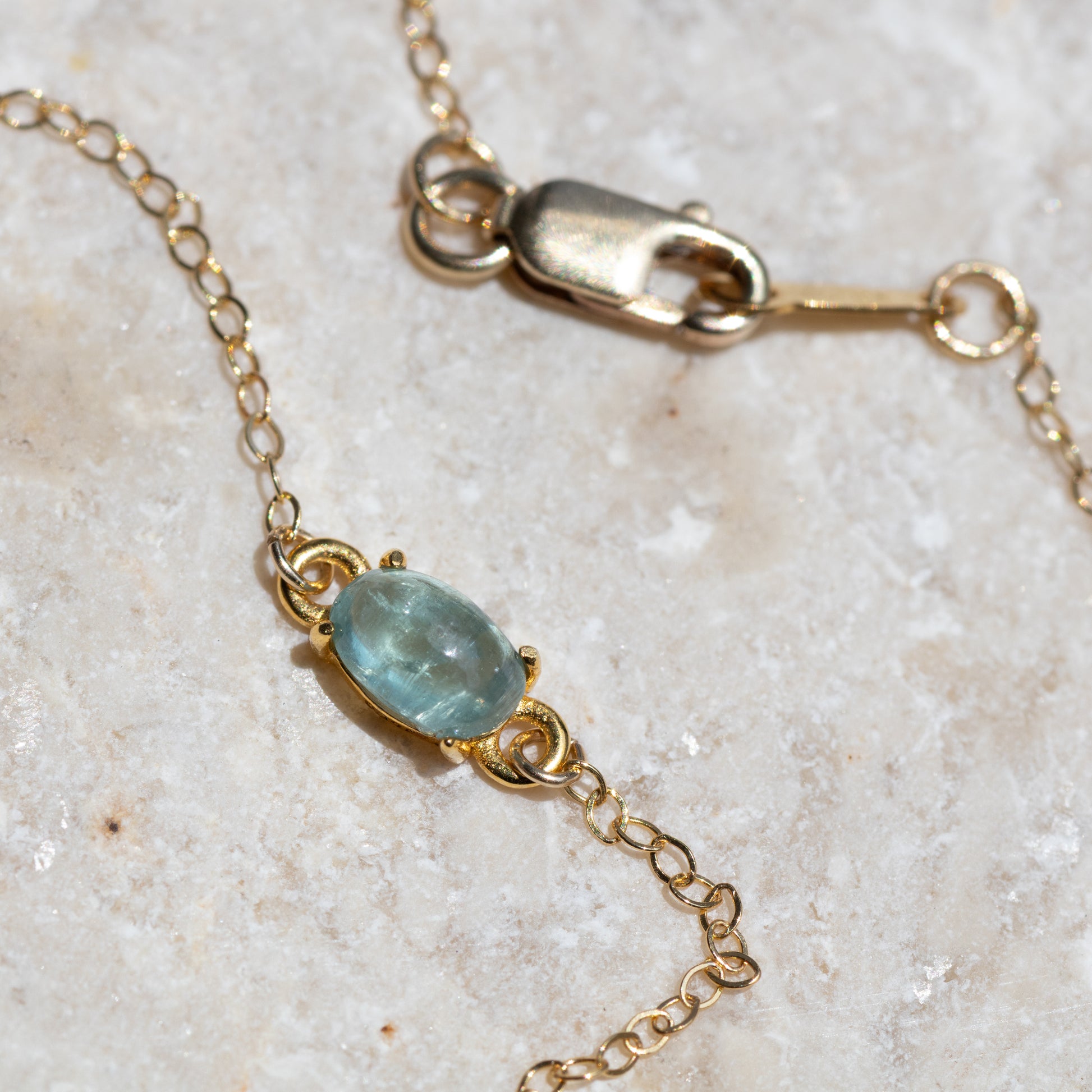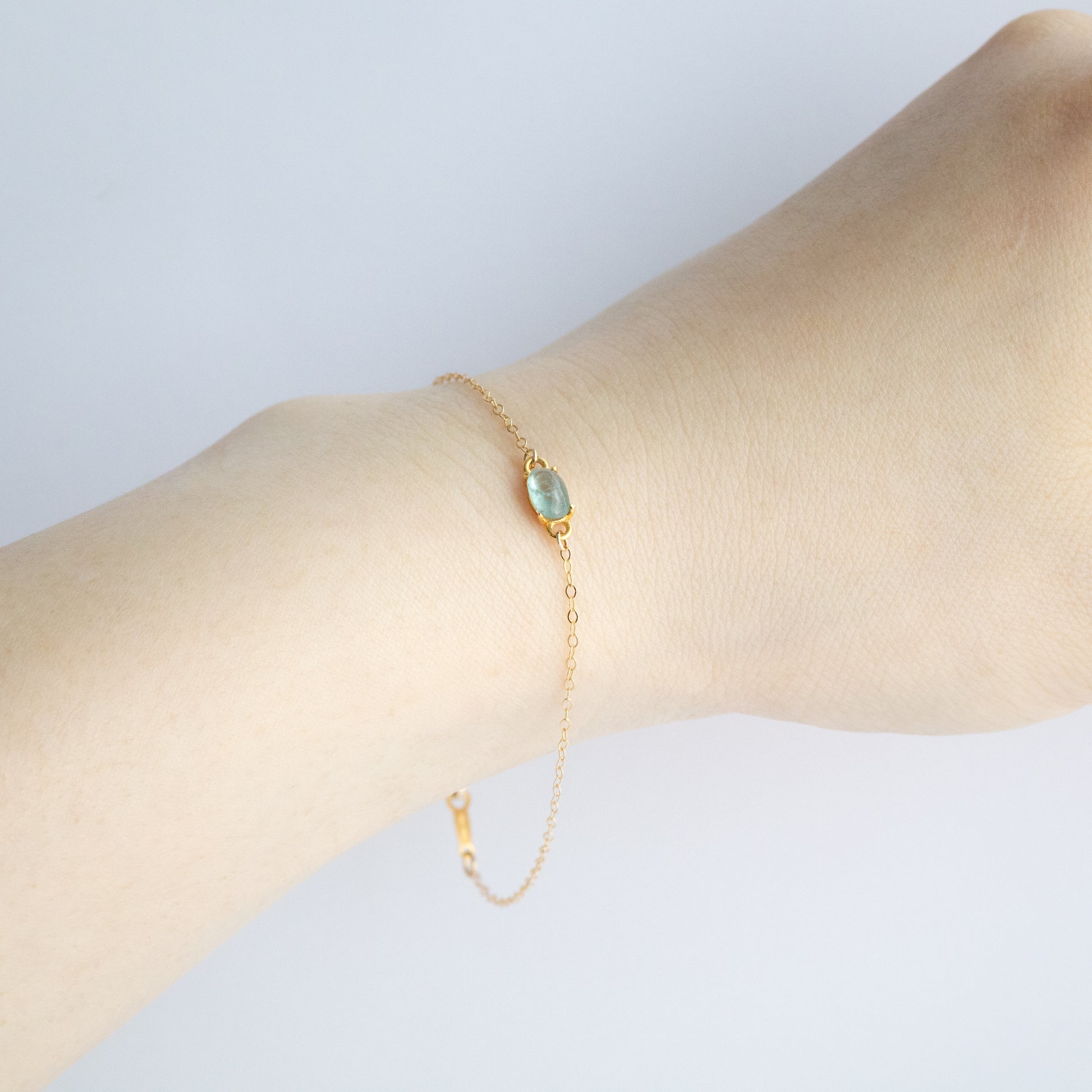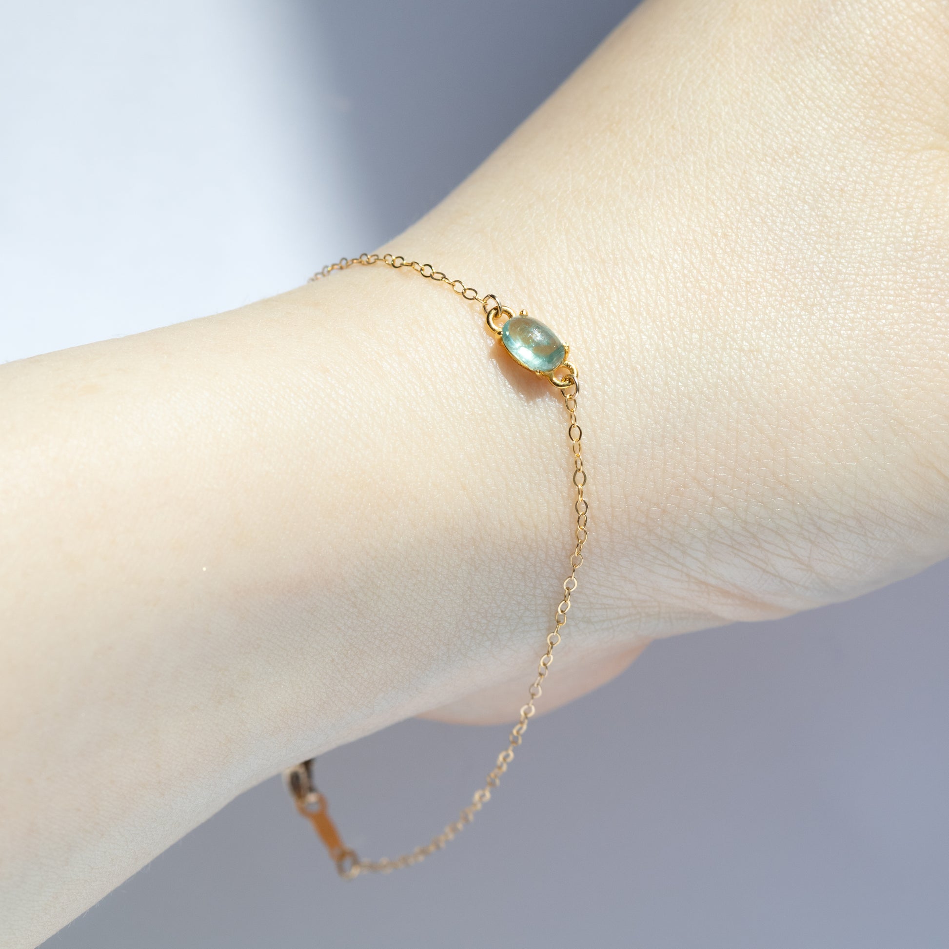 透明度の高いカボションが、光を受けて内側からそっときらめき、手元に静かな存在感をもたらします。