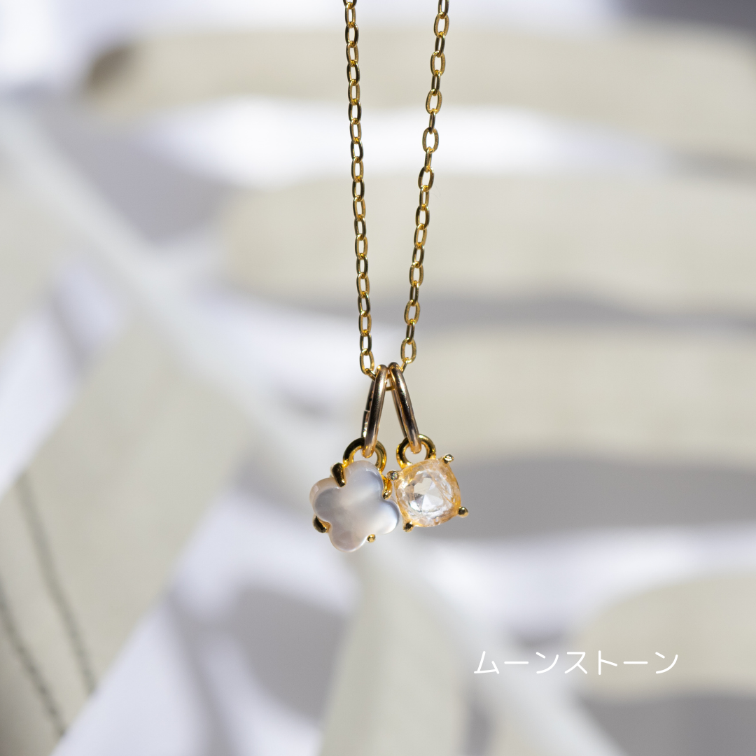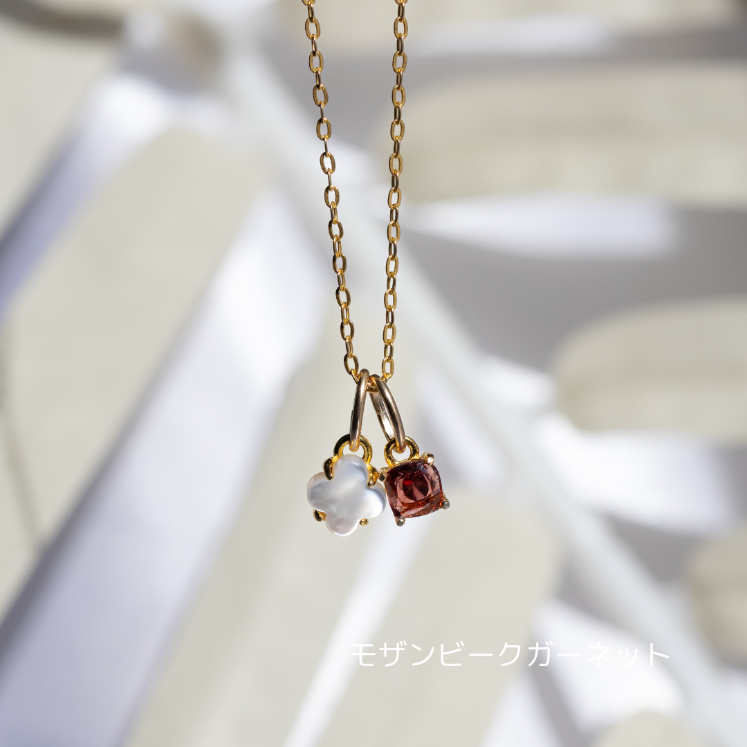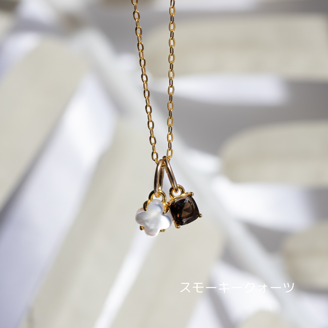 上品な艶を放つホワイトシェルを可憐なフラワーモチーフに仕立て、スクエアカットの天然石チャームを組み合わせた3wayネックレス。