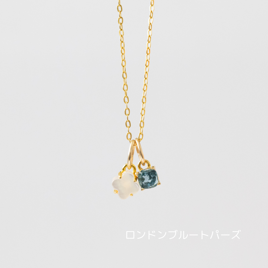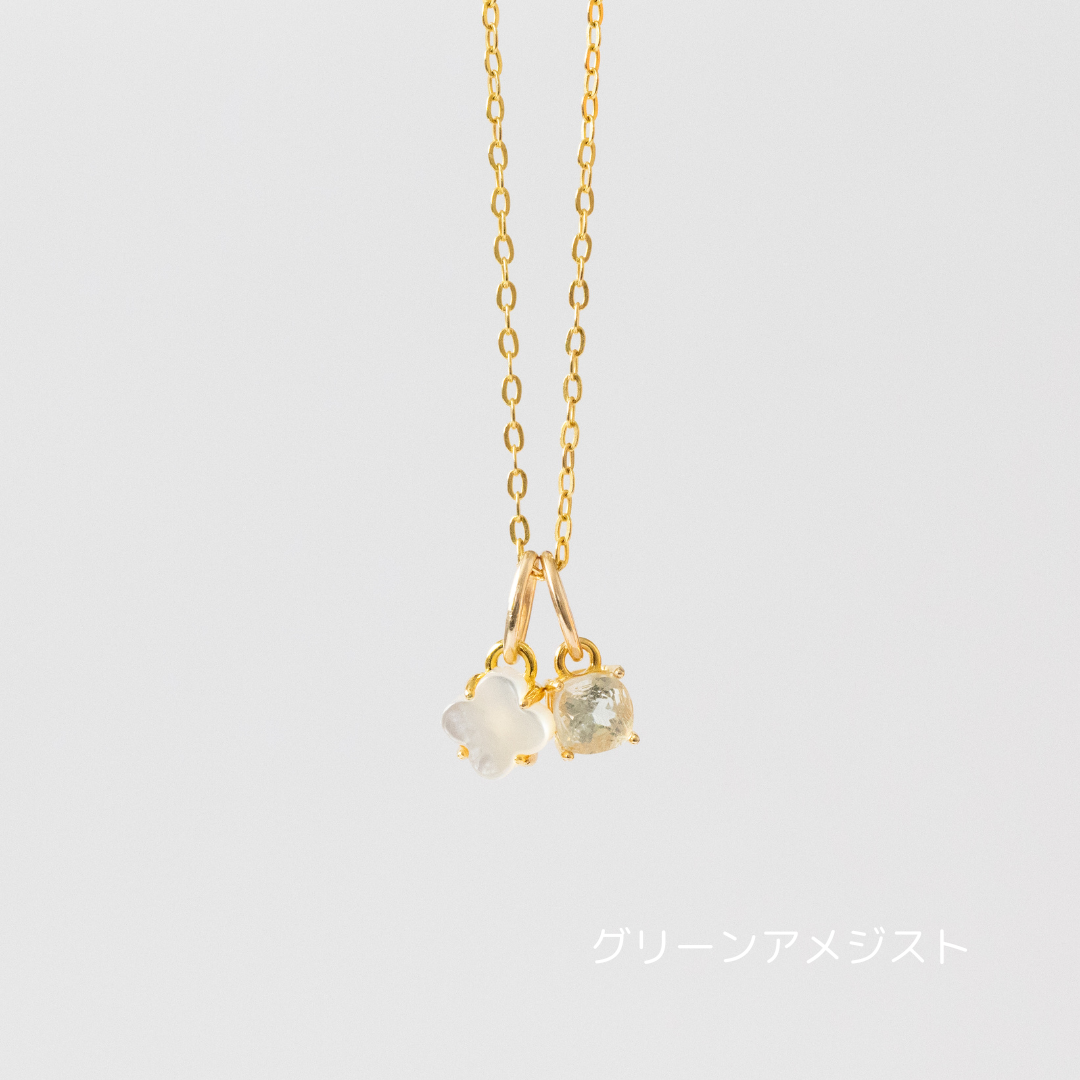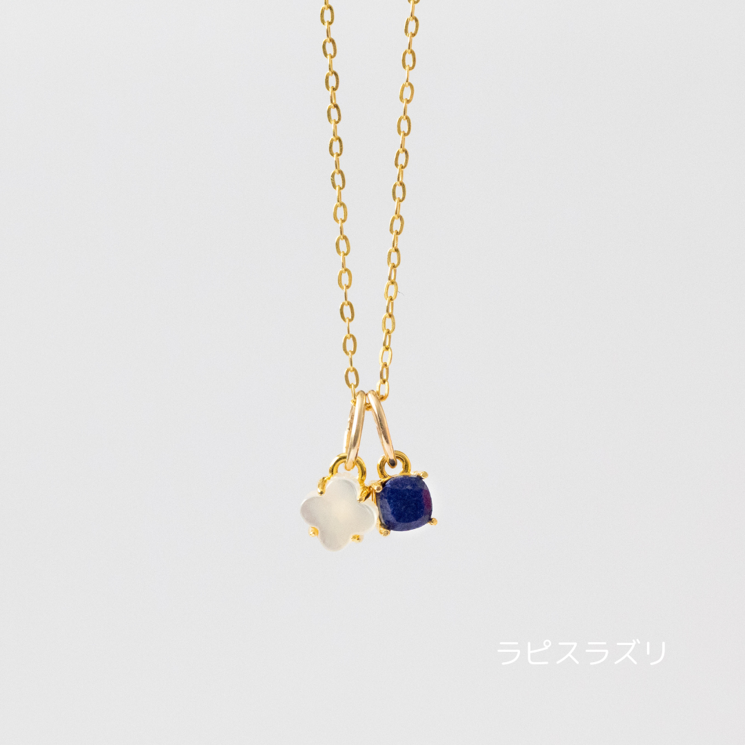上品な艶を放つホワイトシェルを可憐なフラワーモチーフに仕立て、スクエアカットの天然石チャームを組み合わせた3wayネックレス。
