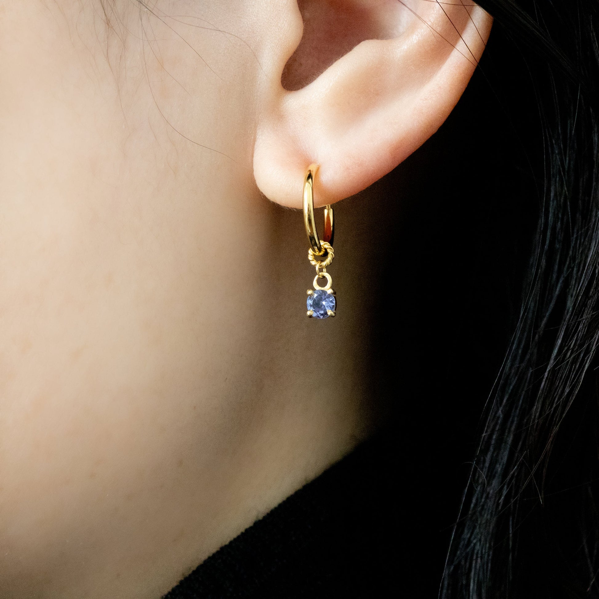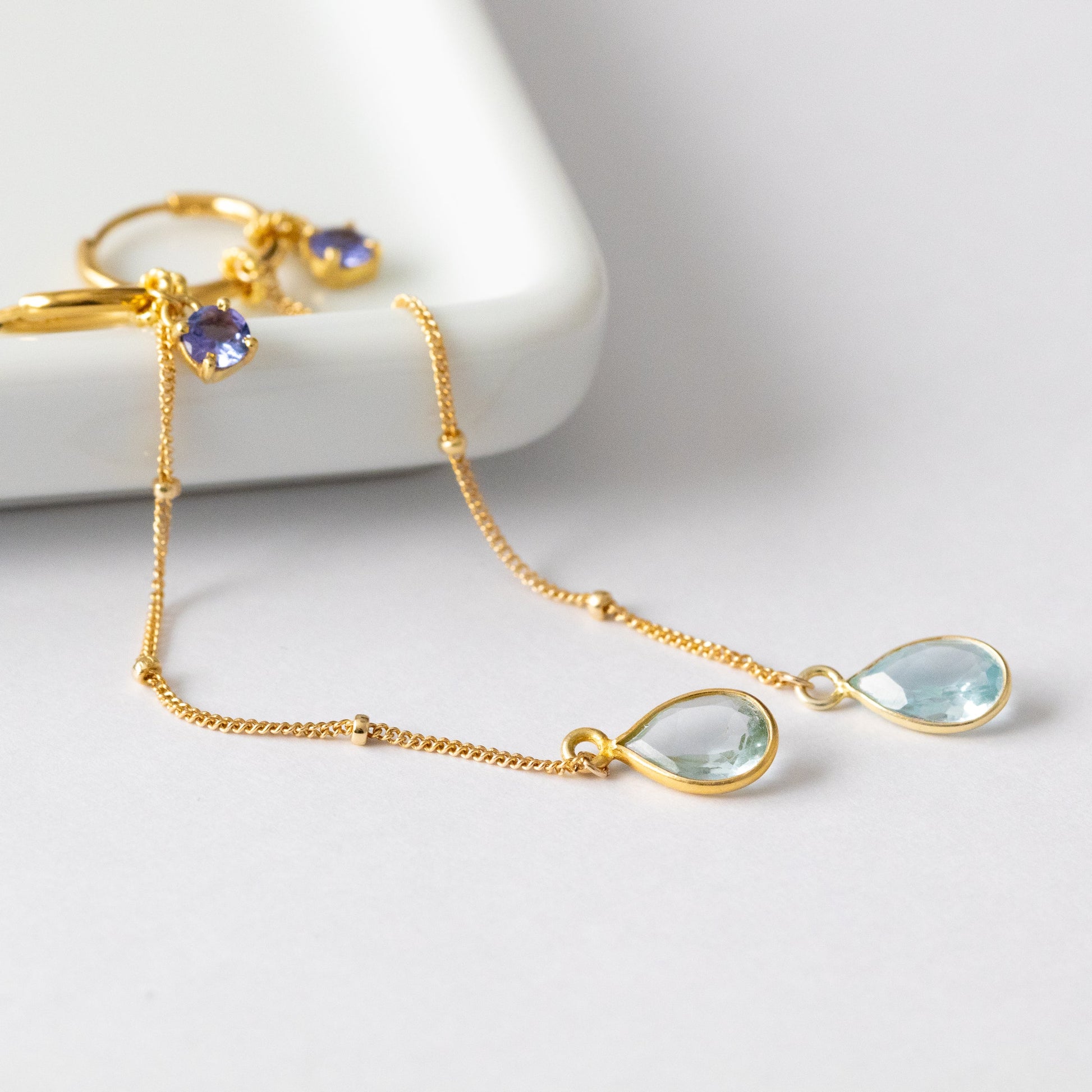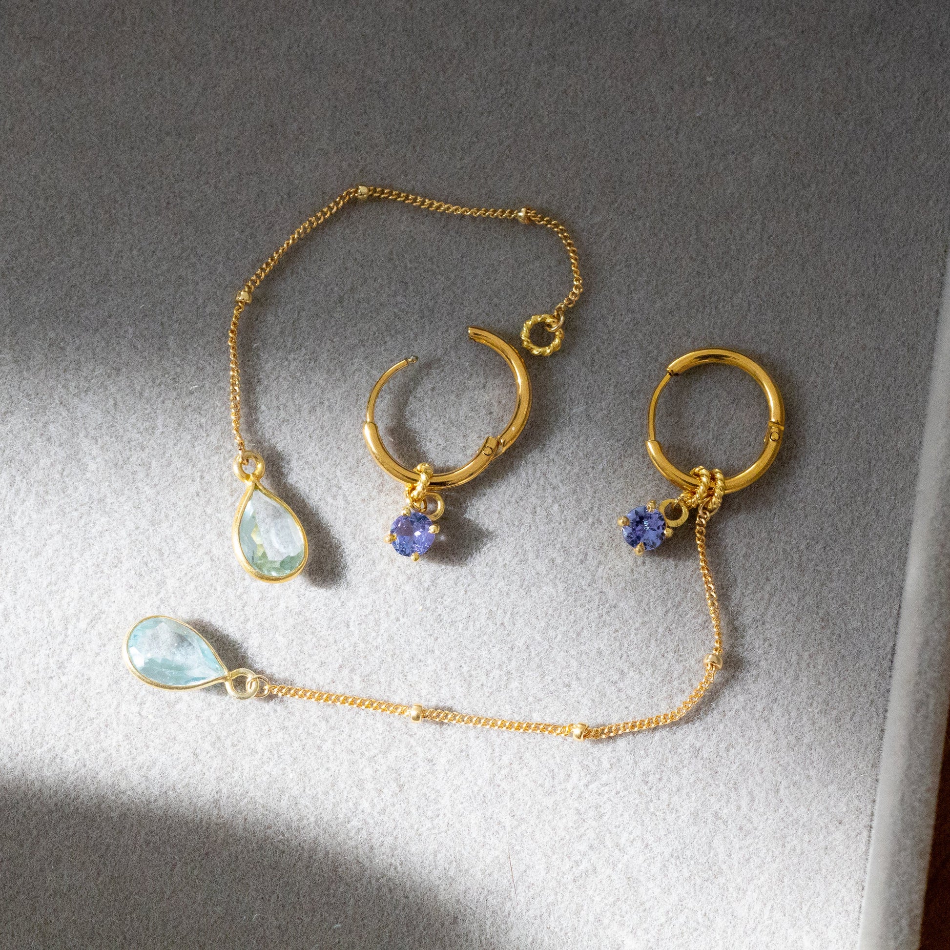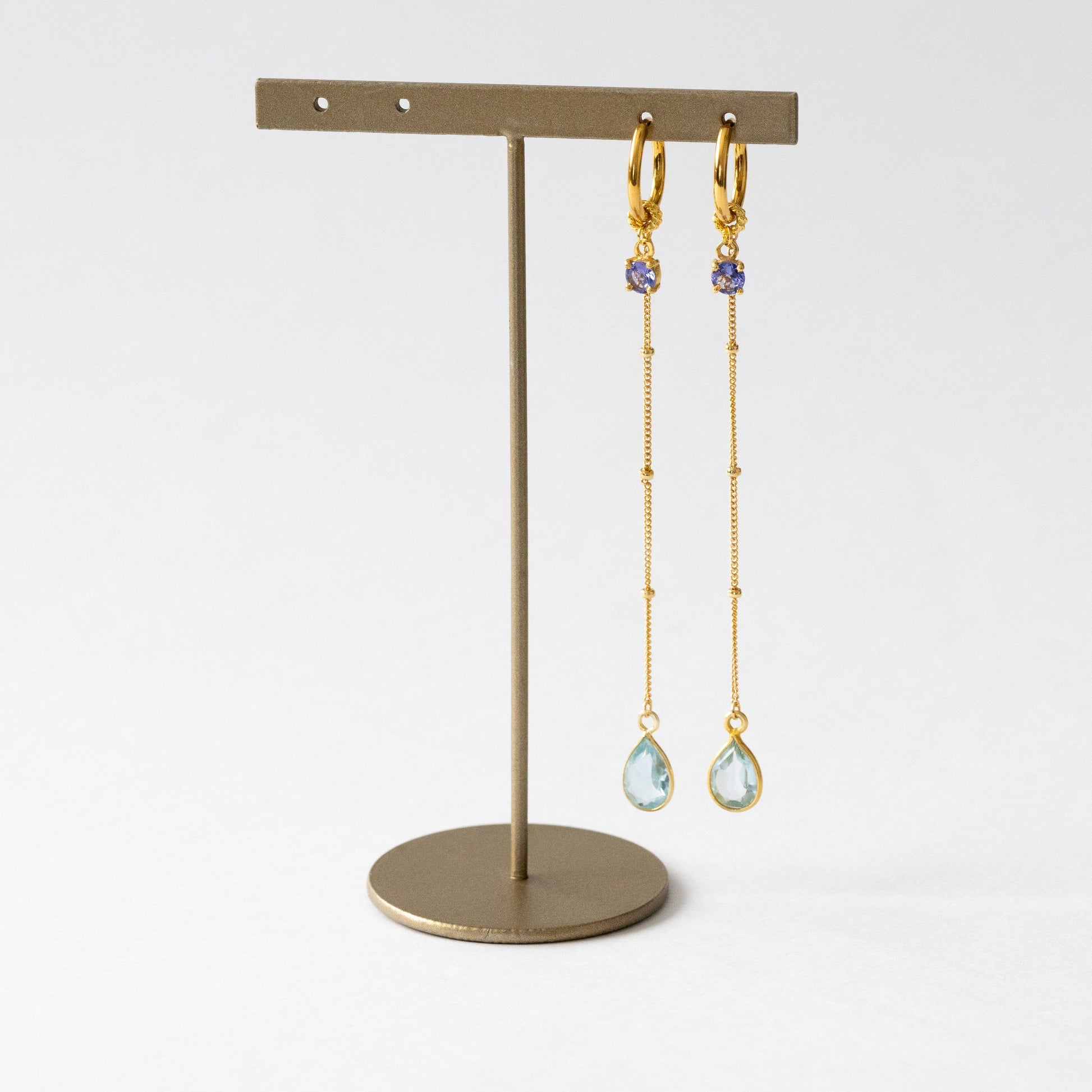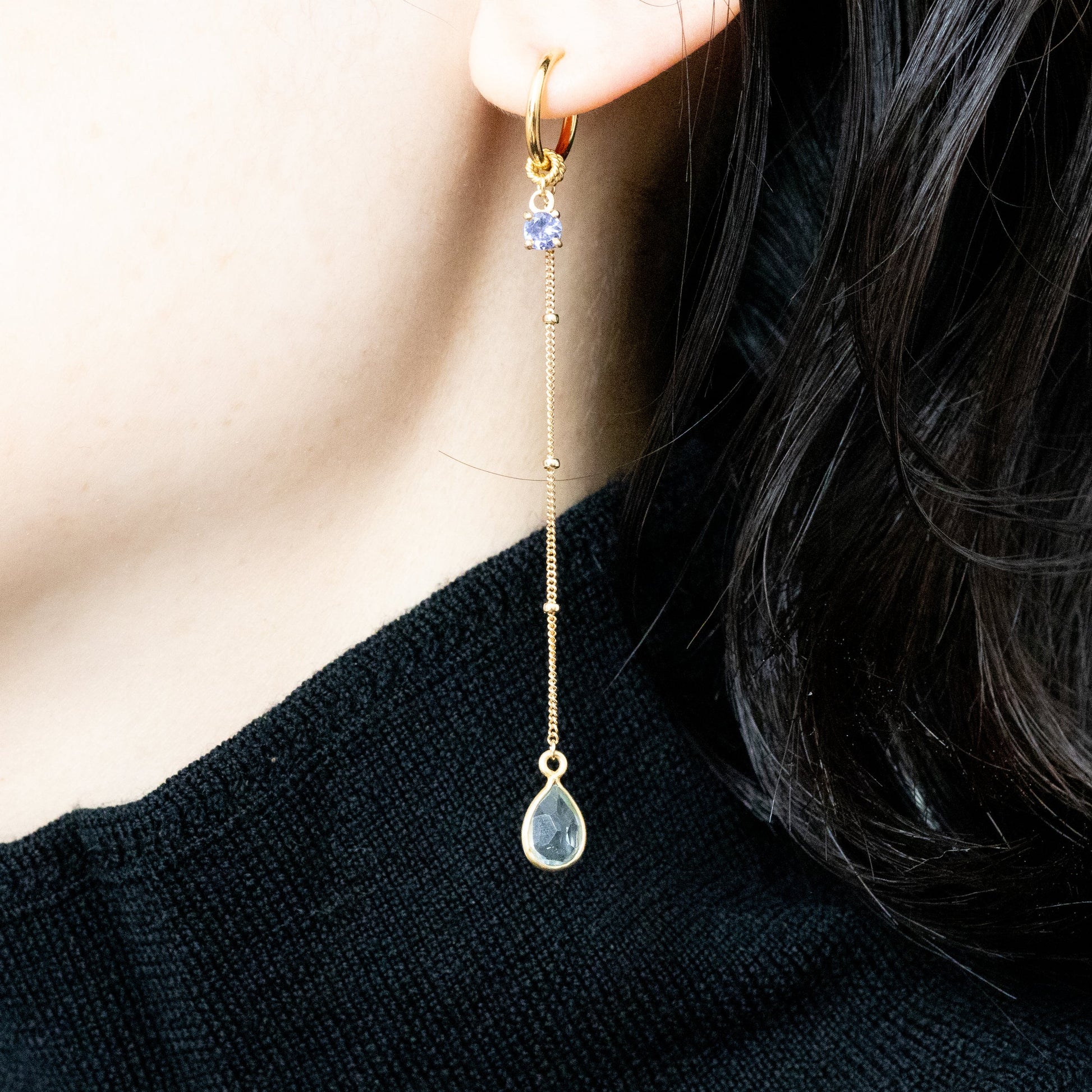 夕暮れの空を思わせるようなタンザナイトとスカイブルートパーズのグラデーション、華奢で繊細なチェーンの煌めきが耳元に女性らしさを演出します。