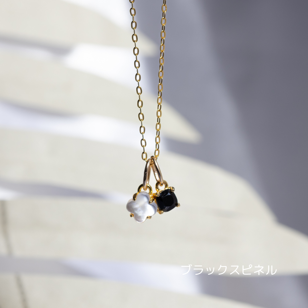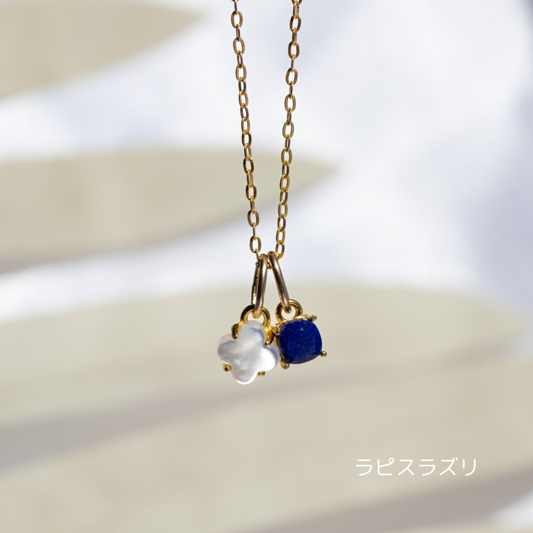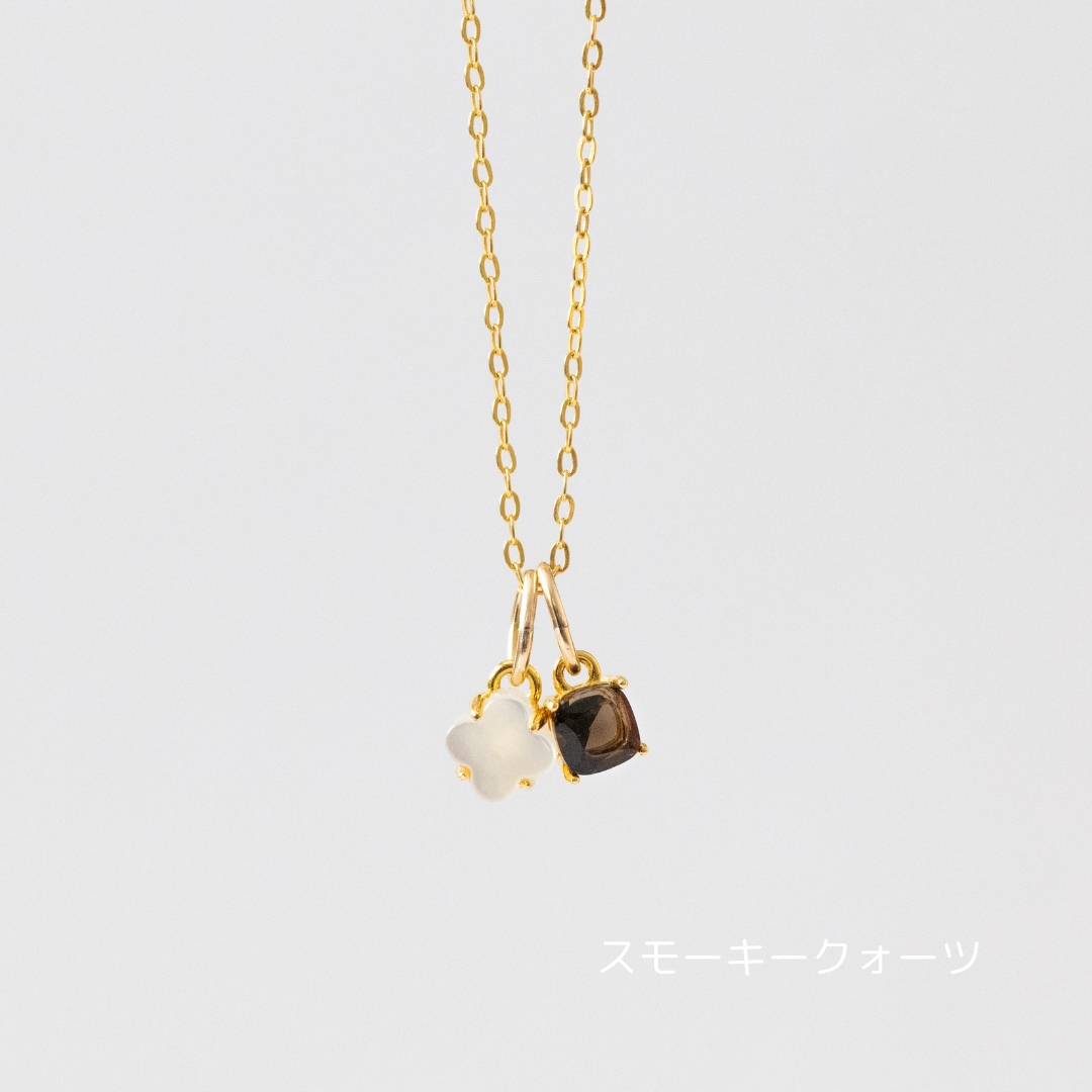 上品な艶を放つホワイトシェルを可憐なフラワーモチーフに仕立て、スクエアカットの天然石チャームを組み合わせた3wayネックレス。