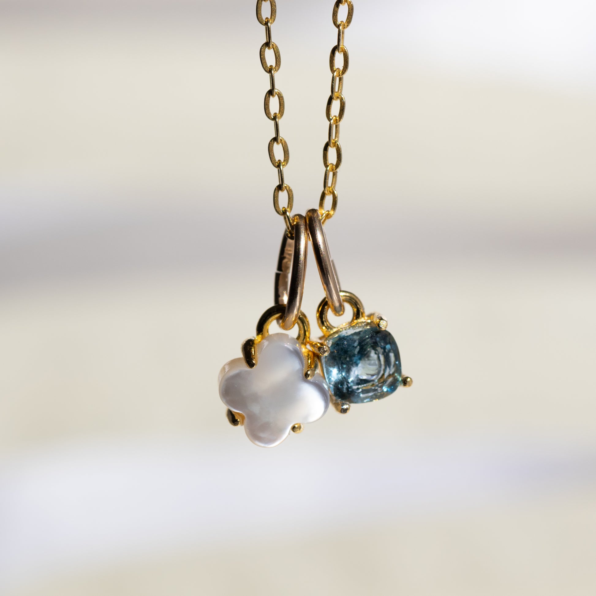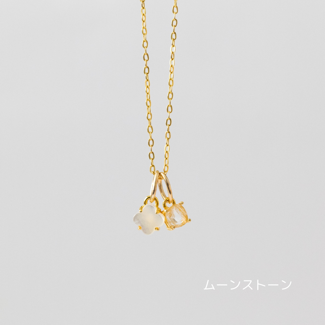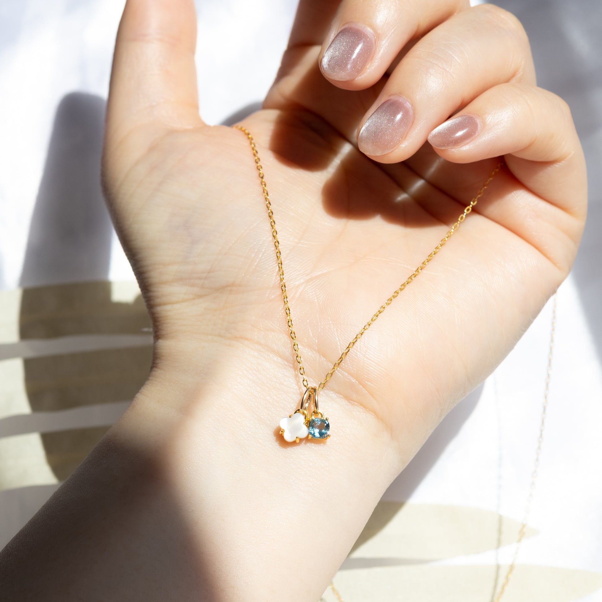 上品な艶を放つホワイトシェルを可憐なフラワーモチーフに仕立て、スクエアカットの天然石チャームを組み合わせた3wayネックレス。