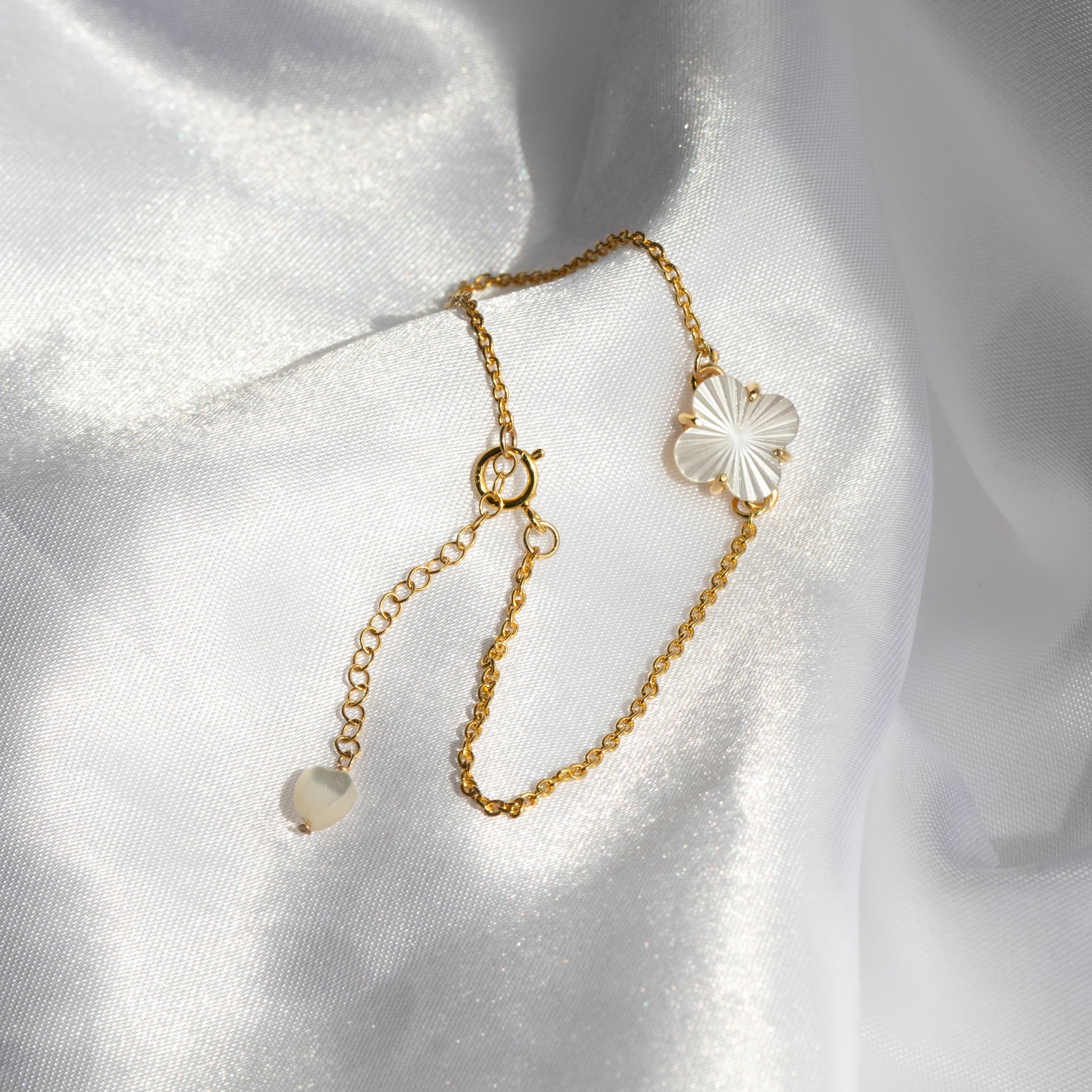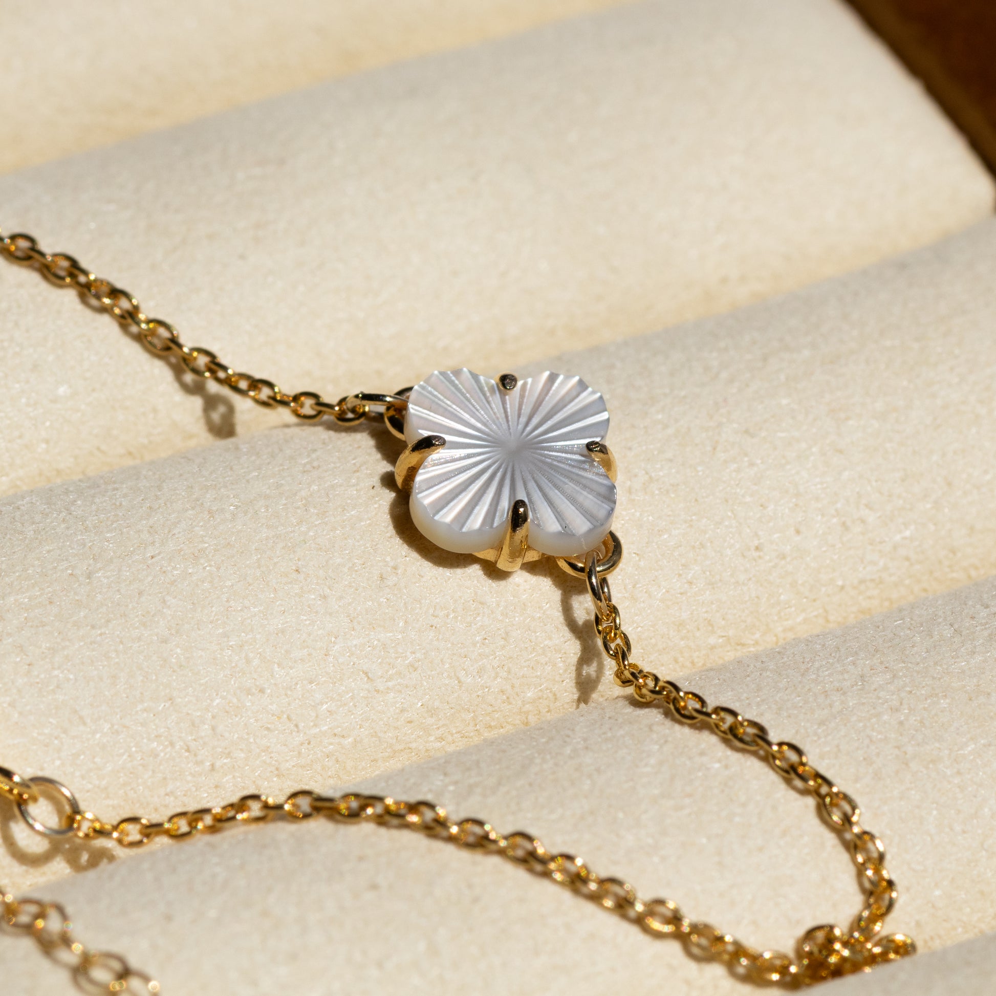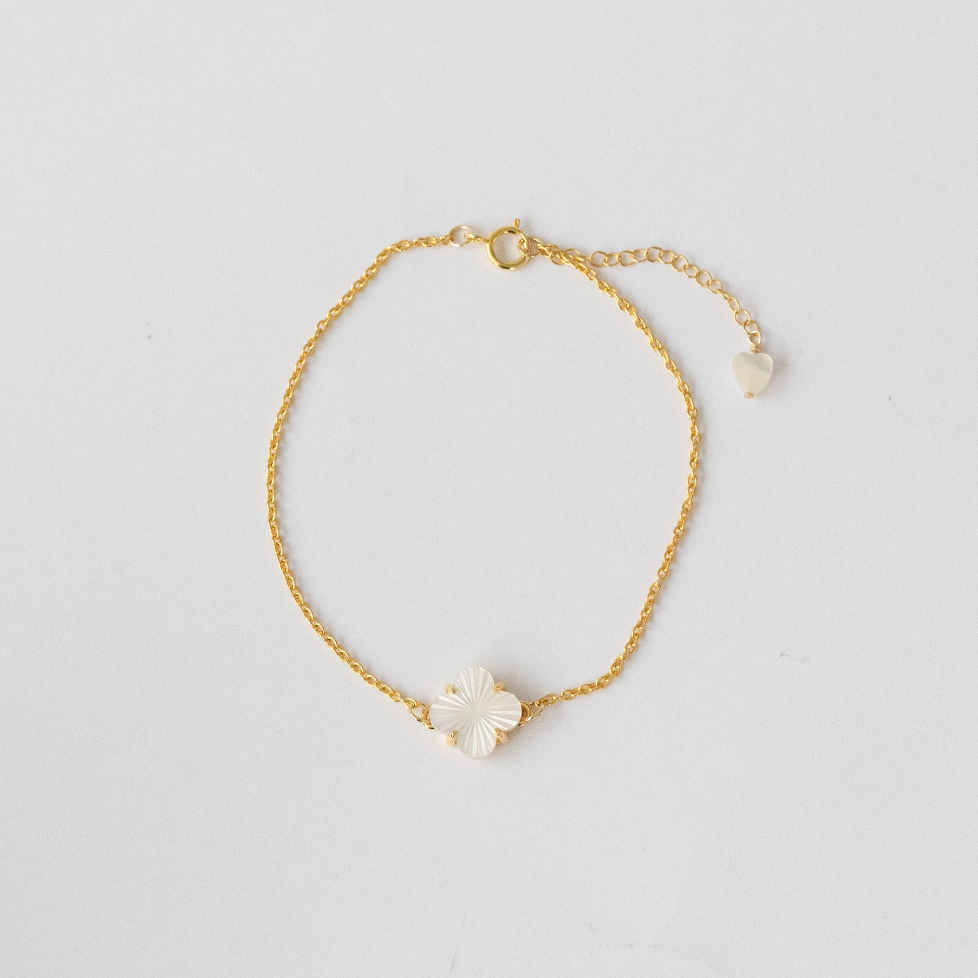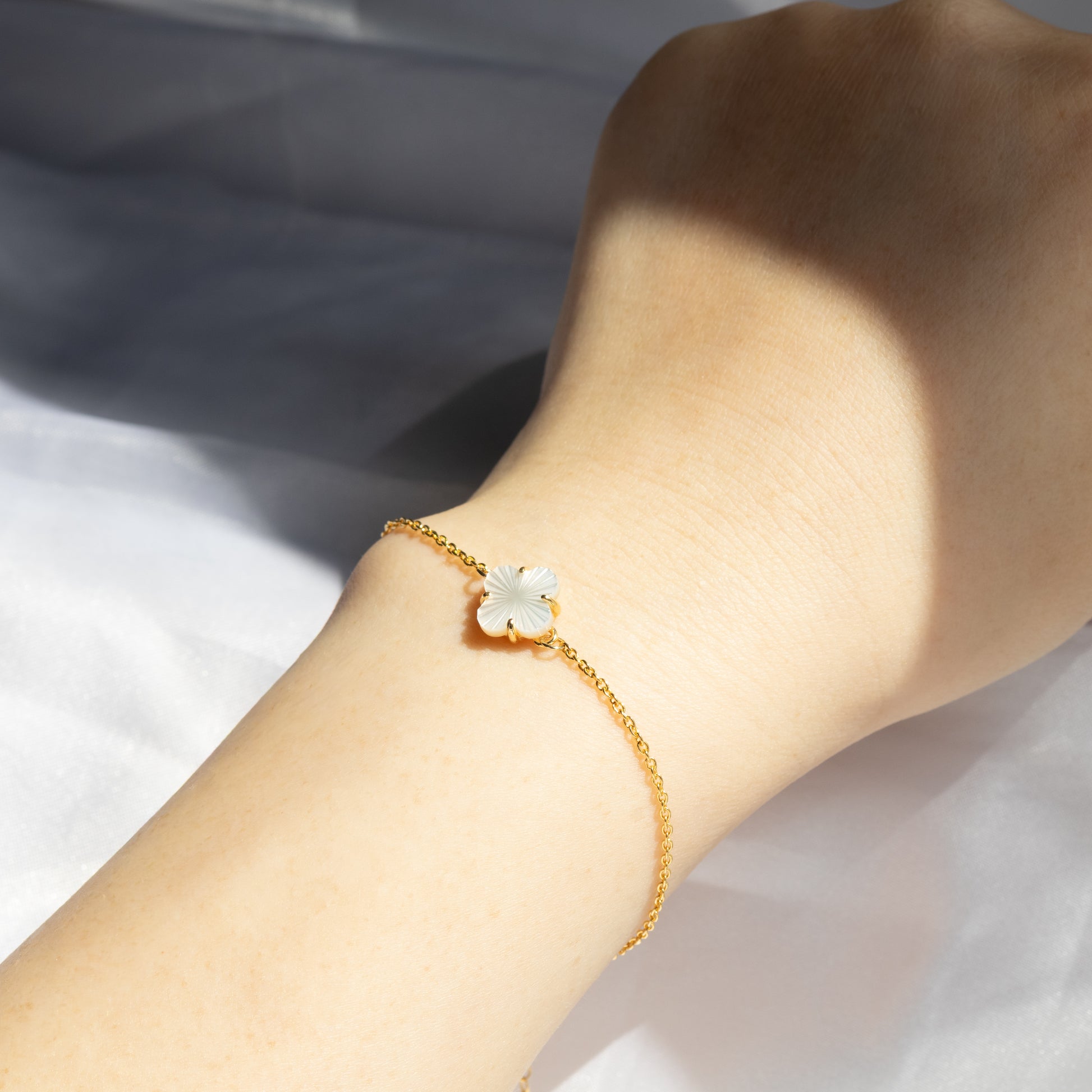 上品に艶めくホワイトシェル(白蝶貝)を花の形に仕立てた、フラワーブレスレット。